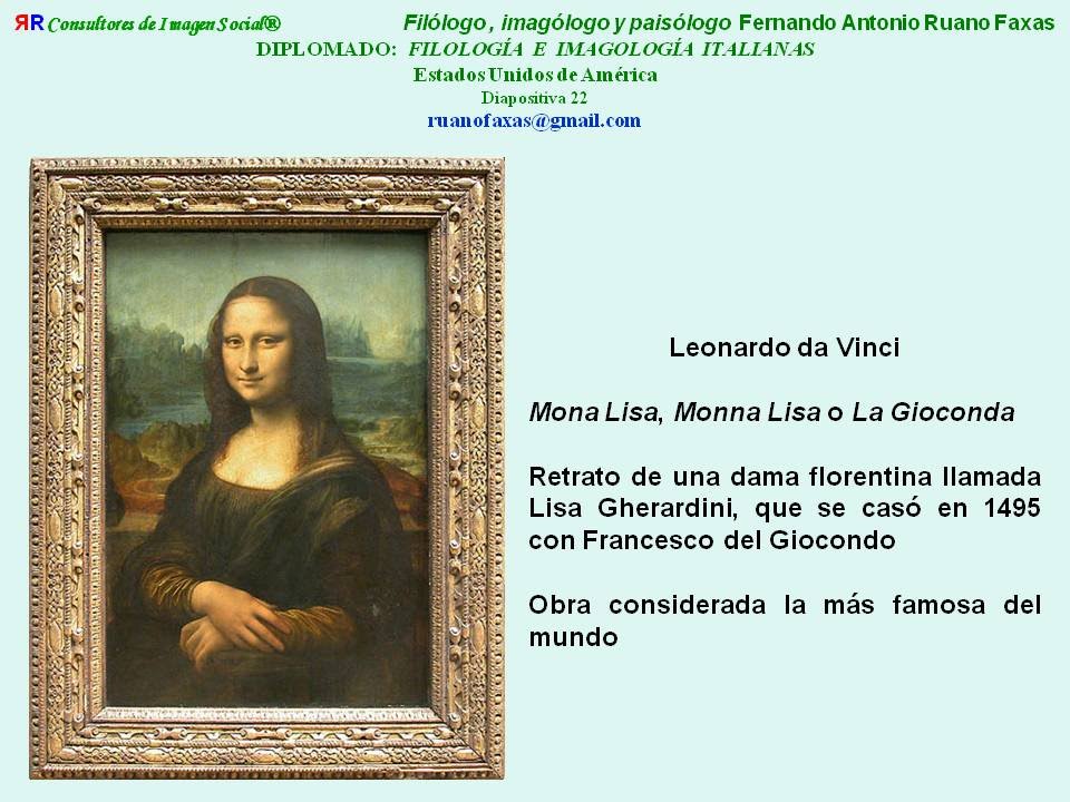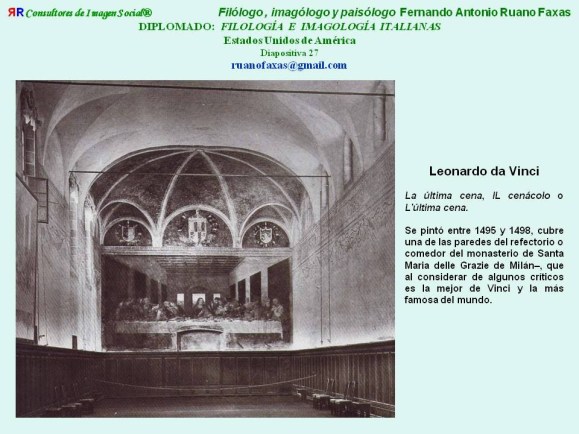 […] ¿Habrá alguna inteligencia que en Leonardo da Vinci no estuviera desarrollada en su máxima expresión? https://ruanofaxas.wordpress.com/article/que-te-consideras-inteligente-pero-de-19j6x763f3uf8-166-2/ , https://ruanofaxas.wordpress.com/2012/05/18/las-imagenes-no-verbales-y-las-imagenes-verbales-tienen-tantas-interpretaciones-como-los-colores-del-arco-iris-un-paseo-por-las-principales-culturas-influyentes-en-la-nueva-globalizacion-un-paseo-po/ , https://ruanofaxas.wordpress.com/article/percepcion-instintos-y-estereotipos-19j6x763f3uf8-95-2/ , http://knol.google.com/k/fernando-antonio-ruano-faxas/qu%C3%A9-te-consideras-inteligente-pero-de/19j6x763f3uf8/166# […] Siempre hablamos de la grandeza de Leonardo da Vinci, en especial por la pintura: “Como artista y sabio, Vinci explica que ‘la pintura, la lengua más bella del espíritu, es el único arte capaz de mostrarnos las cosas como son’. Por primera vez en la historia, el saber por el oído, es decir, por los otros, es sustituido por la visión directa y la intuición personales” (Grawitz, 1984: 38). Leonardo “mostró que conocía el hechizo de infundir vida a los colores esparcidos con sus pinceles prodigiosos” (Gombritz, 1995: 303). Vinci es reconocido, como todos sabemos ya, por la Mona Lisa, Monna Lisa o La Gioconda –retrato de una dama florentina llamada Lisa Gherardini, que se casó en 1495 con Francesco del Giocondo, obra considerada la más famosa del mundo. Está en el museo del Louvre, en París–, y también por La última cena, Il cenácolo o L’última cena –se pintó entre 1495 y 1498, cubre una de las paredes del refectorio o comedor del monasterio de Santa Maria delle Grazie de Milán–, que al considerar de otros críticos es la mejor de Vinci y la más famosa del mundo: