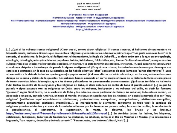 […] ¿Qué si los cubanos somos religiosos? ¡Claro que sí, somos súper religiosos! Si somos sinceros, si hablamos sinceramente y no hipócritamente, entonces diremos que en cuanto a religiones y creencias a los cubanos lo primero que “nos gusta o nos cae bien” es la santería, el espiritismo, la brujería, el ñañiguismo, el chamanismo, la Regla de Osha-Ifá…, es decir todo eso a lo que en antropología, etnología, paisología, artes y tradiciones populares, folclor, folclorismo, folclorística, etc., llaman “cultos alternativos”, aunque muchos cubanos van a las iglesias y a los templos católicos, cristianos, y se autodenominan católicos, cristianos. ¿A qué cubano no santiguaron cuando era chiquito e inclusive ya de grande lo siguen santiguando? ¿En qué casa cubana, inclusive la casa de esos que dicen que son católicos o cristianos, en la casa de sus abuelos, no ha habido o hay un “altar” con santos de esos llamados “cultos alternativos”? ¡Esos altares están a la vista de todos los que tengan ojos y quieran ver! ¡Y si esos altares no están a la vista, si no los ves, entonces busquen debajo de la cama y detrás de las puertas! Los cubanos hemos conocido en carne propia a través de la historia de Cuba el caro precio de tener creencias, ideas, ideologías, que a los tiranos y dictadores les parecen malas y amenazantes. ¡Qué cosas terribles no ha hecho Fidel Castro en contra de las religiones y los religiosos en Cuba, es decir entonces en contra de todo el pueblo cubano! […] Lo que ha pasado y sigue pasando con las religiones en Cuba, entre los cubanos, incluyendo a los cubanos del exilio, es decir los famosos “gusanos” según Fidel Castro, no es exclusivo de Cuba y los cubanos, no es particular de Cuba y los cubanos; todo esto es común, un poco más o un poco, en toda América, en todo el mundo. Inclusive en Estados Unidos de América, en donde la mayoría dice ser “muy religioso” (entiéndase aquí especialmente cristianismo, protestantismo, evangelismo, evangelicalismocristianismo evangélico, protestantismo evangélico, cristianos, evangélicos…), es impresionante (y alarmante: terrorismo de todo tipo) la cantidad de religiones y sectas existentes y el amor de los estadounidenses por los fenómenos paranormales, las ciencias ocultas, la seudociencia o pseudociencia, el esoterismo, la superstición, la magia, la alquimia, las brujas y los brujos…: https://twitter.com/search?f=tweets&q=halloween%20RuanoFaxas%20&src=typd […] En América Latina los latinos, los hispanos, celebramos, festejamos, todo tipo de tradiciones no cristianas, no católicas, como es el Día de Muertos en México, y lo celebramos a lo grande, “con respeto, devoción y de todo corazón”. “Para muestra, dos botones”: Brasil, Haití […]
