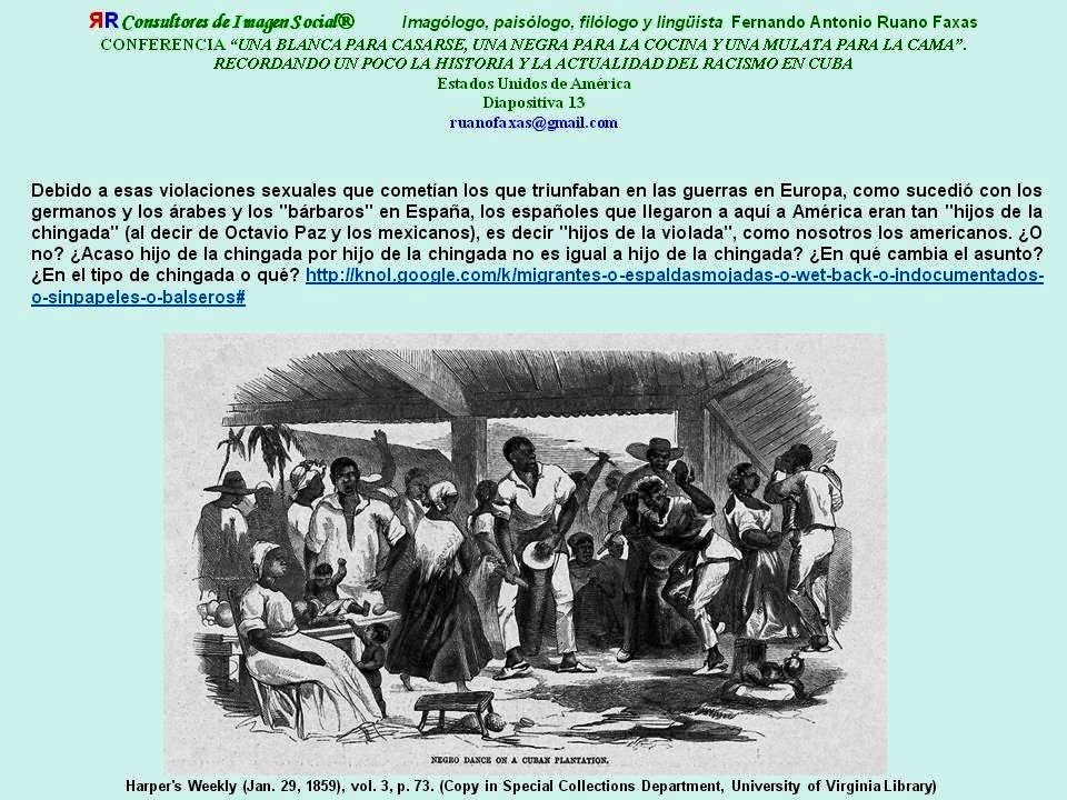 […] recuerdo que las raíces de la música en Cuba hay que buscarlas en la fusión de elementos procedentes de las culturas españolas y africanas porque el aborigen cubano casi desapareció; pero eso sí, del areíto, manifestación danzaria y religiosa de los indios cubanos, aún quedan en la Isla las maracas, los fotutos,[11] las flautillas[12]: la armonía de la naturaleza, la dimensión fálica masculina, ¿¡”la perdición”!? y los tambores: los primeros sonidos, la verdad divina, el habla. Los negros –ese “muestrario original de intensidades”, al decir del genial pintor mexicano Miguel Covarrubias–, en cambio, contribuyeron a fundar una rica y trascendente expresión musical cubana, de belleza y autenticidad reconocidas en el mundo […] Con sólo estar y arrollar en una conga santiaguera, de Santiago de Cuba, de Oriente, se comprueba hasta dónde llega la fuerza de la música negra cubana: ¡qué cosa más rica…! Al ritmo de la conga ”todos los tiempos son buenos” […] Los antecedentes negros de Cuba hay que buscarlos en los mismos antecedentes negros de la humanidad: negro es el Moro de Venecia, negro es Othelo, negro es Baltazar –uno de los Reyes Magos–, negro es el Preste Juan, negra era la novia del Cantar de los Cantares…, “negros también son algunos angelitos”, y también hay que buscarlos en la trata de negros,[13] una historia terrible y vergonzosa, para Cuba y para toda la Humanidad, que siempre estará presente en el tema del racismo #racismo , en el tema de la segregación #segregacion : http://knol.google.com/k/anónimo/una-blanca-para-casarse-una-negra-para/19j6x763f3uf8/97# , https://ruanofaxas.wordpress.com/?s=racismo+en+cuba , https://twitter.com/search?q=racismo%20ruanofaxas&src=typd , https://ruanofaxas.wordpress.com/?s=segregaci%C3%B3n […]