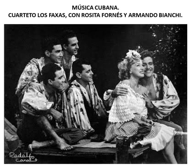 […] de Rita Montaner: http://www.youtube.com/watch?v=tCNMCcgVfXQ , Rosita Fornés: http://www.youtube.com/watch?v=oySr8f88Cv4 , Esther Borja: http://www.youtube.com/watch?v=Zm9dPlqmJtc&feature=related , María Remolá: http://www.youtube.com/watch?v=pYqoabtKmS8 , Alba Marina: http://www.youtube.com/watch?v=bAgEe4ca-eI&feature=related , los geniales Los Zafiros […] El grupo musical Los Zafiros se creó en 1961, en La Habana. El grupo estaba conformado por cinco músicos: Néstor Milí Bustillo, Ignacio Elejalde, Leoncio Murúa, Miguel Cancio, Eduardo Elio Hernández. Hay una canción cubana que le ha dado la vuelta al mundo, me refiero a Yerbero Moderno, y es un pregón creado por Néstor Milí […] «Carlos Faxas Valerino. Fue un destacado pianista, compositor, orquestador, arreglista, instrumentista y director de orquesta cubano. Nombre imprescindible en el panorama sonoro de Cuba a lo largo de más de siete décadas. El 15 de febrero de 1957 dirigió la grabación de la Marcha del 26 de Julio en los estudios de Radio Cadena Habana. El himno del 26 de Julio o el Himno de la libertad, es compuesto por Agustín Díaz Cartaya a finales de 1953, durante los hechos posteriores del asalto de Cuartel Moncada, y la música es dirigida posteriormente por Carlos Faxas en 1957. Este himno está dedicado a los asaltantes que murieron en dicho asalto, y un canto de combate a favor de la libertad del pueblo Cuba y que se transformó en marcha oficial del M-26-7, que entonó por primera vez en las emisiones de Radio Rebelde en 1958. A partir del triunfo de la revolución cubana en 1959, se convirtió en marcha oficial, tanto en actos conmemorativos como militares, políticos, educativos y culturales. Carlos Faxas Valerino Nació el 30 de octubre de 1921, en Manzanillo, ciudad oriental de Cuba. Su padre fue el mejor afinador de pianos de Cuba, según cuenta su hijo, y por ello el pequeño Carlos empezó a tocarlo por afición. Tendría 7 u 8 años cuando su familia se traslada a La Habana en busca de nuevos horizontes. Fallece el 21 de septiembre de 2014 en La Habana, Cuba, a los 92 años de edad. Cuarteto Los Faxas. Reconocido cuarteto masculino cubano creado por Carlos Faxas en los primeros años de la década del 50. Carlos Faxas en los primeros años de la década del cincuenta funda un cuarteto masculino para completar la programación musical de la televisión que entonces se hacía en vivo. El cuarteto Faxas se hizo famoso por sus actuaciones en los programas más estelares de la radio y la televisión cubana, y también, por su presentación durante años en las revistas musicales del cabaret Tropicana dirigidos por el célebre Rodney. Grabaron cinco discos y actuaron como cuarteto vocal en los discos de otras estrellas cubanas como Olga Guillot y Fernando Albuerne […] Gustavo Faxas de Miguel, llamado cariñosamente “Tavín” en la familia. Fue pianista y cantante, nació en 1929.  Estuvo en el Cuarteto Faxas en la década de los cincuenta, un cuarteto masculino de voces que tuvo mucho éxito sobre todo acompañando a otros artistas. En los años 60 salió de Cuba residiendo y trabajando en Nueva York y Miami, pero llevaba años residiendo en Puerto Rico donde apareció asesinado. Falleció en San Juan en 1985» […]