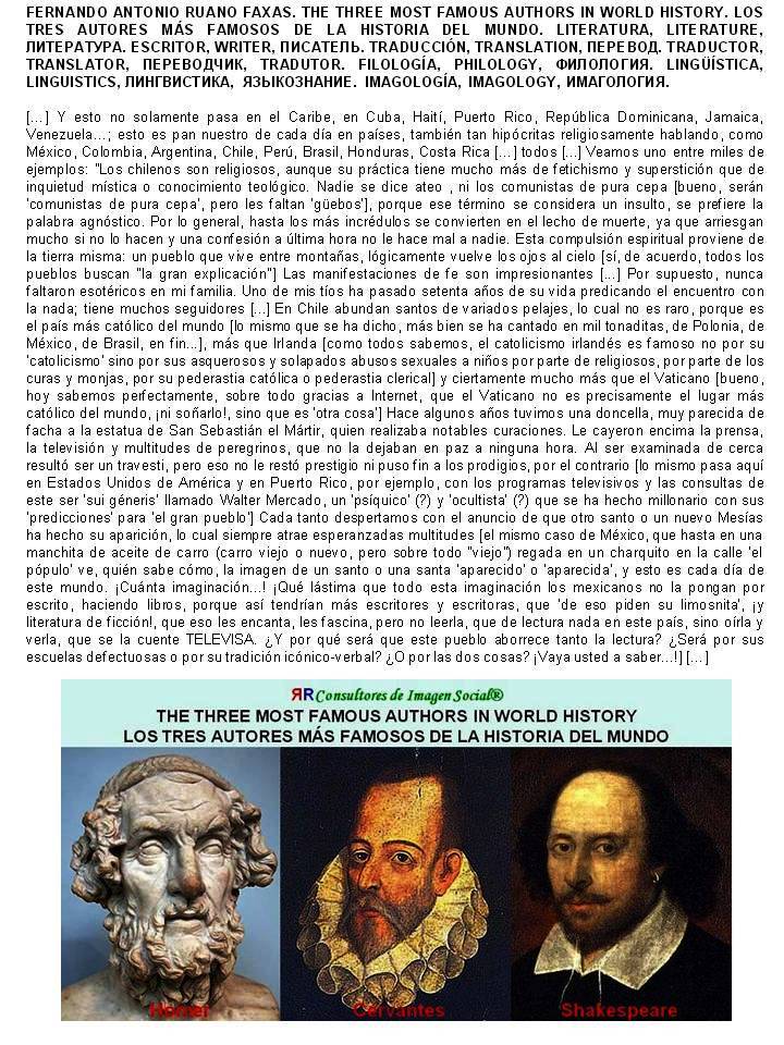 […] Sólo una vez he visto que el traductor ha sido tan célebre, tan conocido, tan grandioso, tan multifacético, tan hombre-orquesta, tan nunca olvidado, “tan-tan”, que ha más que súper superado al escritor original, que ha superado en creces al creador literario, que cuando se menciona el texto, el libro, en este caso la novela, inclusive en su lengua original, casi nadie sabe quién fue el autor o la autora, el creador o creadora, casi nadie sabe quién escribió realmente ese libro. Me refiero al gran portento, al único, al arrasador, al incomparable en su tipo, al cubano José Martí https://ruanofaxas.wordpress.com/2012/02/15/los-cubanos-felix-varela-y-jose-marti-19j6x763f3uf8-122-2/ […] que vivió entre 1853 y 1895, que vivió nada más 42 años, que murió tan joven, como ese genio ruso de Aleksandr Pushkin, que vivió entre 1799 y 1837, que vivió nada más 38 años […] También tempranamente murió Sor Juana, a los 43 años de edad. A estos tres escritores los mataron. A Martí lo mataron tres balazos en la guerra, en el combate. A Pushkin lo mató un balazo en el medio del pecho, en un duelo. A Sor Juana la mató la Iglesia Católica, el clero envidioso, misógino, criminal, corrupto, ladrón, pederasta, tétrico y frustrado, que ya la había matado en vida, a Sor Juana la mató la Inquisición y esa España retrógrada, viciosa y corrupta, contrarreformista, fanática, inquisidora, intolerante, misógina, traidora y déspota (Martín, 2009), que decidió los destinos de toda Hispanoamérica desde 1492 hasta 1898, y en este caso de México cuando era la Nueva España, es decir entre 1521 y 1821, a Sor Juana la exterminó esa España que hoy, todavía, no ha podido “cerrar con siete llaves el sepulcro del Cid” (como decía Joaquín Costa […] ): ahí está gritando, llorando, la historia mora de España, la historia árabe de España, por el ataque a Iraq, un Iraq que es tan árabe como una gran parte de las entrañas de España […] En el sentido de lo que comentaba yo más arriba acerca de José Martí y su labor traductológica, me refiero al libro, a la novela,Ramona. La escritora de ese libro es la estadounidense Helen Hunt Jackson, que vivió entre 1830 y 1885, y el que lo tradujo fue José Martí. Helen era una buena escritora, para mi gusto encantadora, pero jamás ese libro en su original, en inglés, tuvo el súper éxito de la traducción de Martí: ¡arrasó!, y arrasó antes y sigue arrasando ahora. Claro, Helen escribió ese libro con su mente y con su corazón; Helen fue una de las primeras protectoras y defensoras de las comunidades indígenes, de los pueblos indígenas, de América; pero Martí le puso a la traducción de esa novela Ramona la marca de los dioses, esa marca que sólo pueden poner “los escogidos”. ¿Qué cosa no habría puesto Martí en la traducción de esta novela al español, si por dar este hombre dio hasta su vida por esta América, sometida antes y sometida ahora? Cuando se habla de la novela Ramona, la mayoría de la gente sigue diciendo: “Ah, sí, la novela de Martí” […] Imagino que si existe “el más allá”, “la otra vida”, “el otro mundo”, todavía Helen le estará dando las mil gracias a Martí, porque de no haber tocado con sus manos, su mente y su corazón este Midas-Literario, este Midas-Traductor, a esa novela, a Ramona, nadie o poquísima gente conocería esta bonita, esta magnífica novela […] ¿¡Cuántas cosas nos habrían legado estos genios, Martí y Pushkin, de haber vivido unos añitos más, sólo unos añitos más, si eran unas maquinarias perfectas de la creación artístico-literaria, de la imaginación!? ¿¡De cuántas maravillas nos perdimos!? Si con lo que nos dejaron, que ya es muchísimo, pero muchísimo, todavía seguimos embelesados… Pero así sucede con algunos “dioses de la literatura”, se van rápido a sus edenes para no vernos. A veces creo que les da asco vivir en esta mierda de mundo tan disparejo y conflictivo, tan tóxico https://ruanofaxas.wordpress.com/2012/08/18/social-toxicity-toxicidad-social-toxicidade-sociais-%D1%81%D0%BE%D1%86%D0%B8%D0%B0%D0%BB%D1%8C%D0%BD%D0%B0%D1%8F-%D1%82%D0%BE%D0%BA%D1%81%D0%B8%D1%87%D0%BD%D0%BE%D1%81%D1%82%D1%8C-toxicite-sociale/ […] Es lo que también siempre he dicho acerca de la “muerte rara” de Ikram Antaki en México https://ruanofaxas.wordpress.com/2012/05/09/a-proposito-del-excelente-libro-el-pueblo-que-no-queria-crecer-de-ikram-antaki-y-el-nuevo-presidente-de-mexico-y-su-gobierno-tambien-van-a-deshacerse-de-manera-tan-burda-tan/ , https://ruanofaxas.wordpress.com/article/panorama-de-mexico-en-el-siglo-xxi-los-19j6x763f3uf8-24-2/ , http://knol.google.com/k/panorama-de-m%C3%A9xico-en-el-siglo-xxi-los-principales-problemas-de-m%C3%A9xico-parte-i# […] A Sor Juana Inés de la Cruz, esa célebre mujer de las letras y las ciencias, la mató el mismo catolicismo, el mismo cristianismo, que también asesinó a la brillante científica griega Hipatia o Hypatia […]