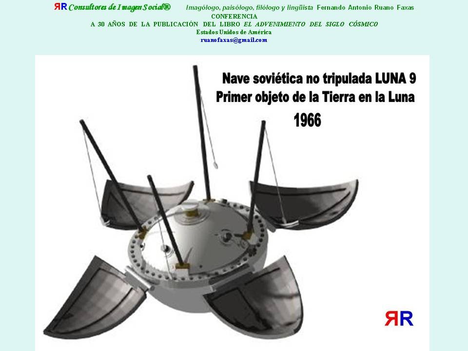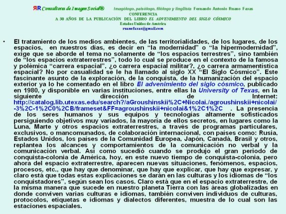 […] No por casualidad se le ha llamado al siglo XX “El Siglo Cósmico”. Este fascinante asunto de la exploración, de la conquista, de la humanización del espacio exterior ya lo he comentado en el libro El advenimiento del siglo cósmico, publicado en 1980, y disponible en varias instituciones, entre ellas la University of Texas, en la siguiente dirección de Internet http://catalog.lib.utexas.edu/search?/aGroushinskii%2C+Nicolai./agroushinskii+nicolai/-3%2C-1%2C0%2CB/frameset&FF=agroushinskii+nicolai&1%2C1%2C […] La presencia de los seres humanos y sus equipos y tecnologías altamente sofisticados persiguiendo objetivos muy variados, la mayoría de ellos secretos, en lugares como la Luna, Marte y otros espacios extraterrestres, a través de programas particulares, exclusivos, o mancomunados, de colaboración internacional, con países como: Rusia, Estados Unidos, los países de la Comunidad Europea, Japón, Canadá, Brasil y otros, replantea los alcances y comportamientos de la comunicación no verbal y la comunicación verbal. Así como sucedió cuando se produjo el gran periodo de conquista-colonia de América, hoy, en este nuevo tiempo de conquista-colonia, pero ahora del espacio extraterrestre, aparecen nuevas situaciones, fenómenos, espacios, procesos, etc., que hay que denominar, que hay que explicar, que hay que expresar, y claro está que todas estas explicaciones se darán en las culturas y los idiomas de “los conquistadores”, según sean los casos. Claro está que en el espacio extraterrestre, de la misma manera que sucede en nuestro planeta Tierra con las áreas globalizadas en donde conviven varias culturas e idiomas, también conviven individuos de culturas, protocolos, etiquetas e idiomas y dialectos diferentes, muestra de lo cual son las estaciones espaciales […] Como he dicho ya en https://ruanofaxas.wordpress.com/article/reflexiones-imagologicas-en-torno-a-los-19j6x763f3uf8-87-2/ , http://knol.google.com/k/reflexiones-imagol%C3%B3gicas-en-torno-a-los-protocolos-de-la-muerte# […] hoy se depositan hasta cadáveres, muertos, en el espacio. Parece que ya no es suficiente toda la “basura espacial” que tenemos […] las formas en que se despide al cadáver del “plano de la vida terrenal”, tales como enterramiento, enterrar, cremación, cremar, deposito del cadáver en áreas lacustres, es decir un “enaguamiento”, “enaguar”, algo común en las culturas fluviales o con tradición de depositar sus cadáveres en el agua, como los vikingos, y anteriormente, en el pasado, con las personas que morían en alta mar, etc., depósito del cadáver en áreas extraterrestres, es decir un “enaireamiento”, “enairear”, si es en el aire, una especie de “funeral espacial”, de “funeral en el espacio”, y si en el futuro es en otro planeta o satélite, pues será “enlunamiento”, “enlunar”, “enmarteamiento”, “enmartear”, etc., algo que hace un tiempo ya se viene practicando, un servicio funerario “de altura” que parece que estrenó, con otros cadáveres, el famosísimo y riquísimo Gene Roddenberry http://es.wikipedia.org/wiki/Gene_Roddenberry […] Obviamente, estos “servicios funerarios espaciales”, estos “enaireamientos”, son para “exclusivamente” individuos y familias muy ricas, como puede verse a través de Space Services Inc. http://en.wikipedia.org/wiki/Space_Services_Inc. , http://www.celestis.com/ […]