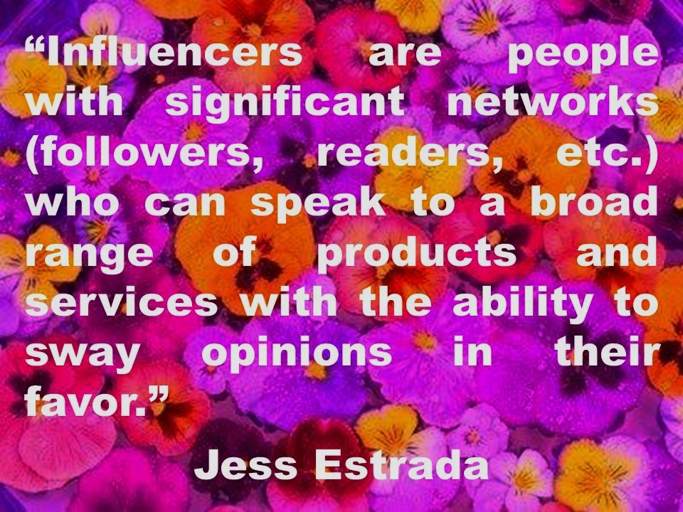 “Influencers are people with significant networks (followers, readers, etc.) who can speak to a broad range of products and services with the ability to sway opinions in their favor.”
