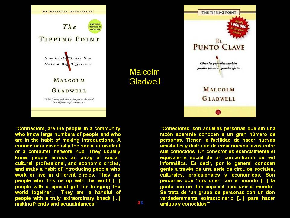 “Conectores, son aquellas personas que sin una razón aparente conocen a un gran número de personas. Tienen la facilidad de hacer nuevas amistades y disfrutan de crear nuevos lazos entre sus conocidos. Un conector es esencialmente el equivalente social de un concentrador de red informática. Es decir, por lo general conocen gente a través de una serie de círculos sociales, culturales, profesionales y económicos. Son personas que ‘nos unen con el mundo […] la gente con un don especial para unir al mundo’. Se trata de ‘un grupo de personas con un don verdaderamente extraordinario […] para hacer amigos y conocidos’”