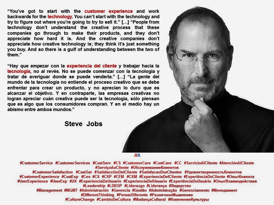 “Hay que empezar con la experiencia del cliente y trabajar hacia la tecnología – no al revés. No se puede comenzar con la tecnología y tratar de averiguar donde se puede venderla.” […] “La gente del mundo de la tecnología no entiende el proceso creativo que se debe enfrentar para crear un producto, y no aprecian lo duro que es alcanzar el objetivo. Y en contraparte, las empresas creativas no logran apreciar cuán creativa puede ser la tecnología, sólo piensan que es algo que los consumidores compran. Y en el medio hay un abismo entre ambos mundos.”