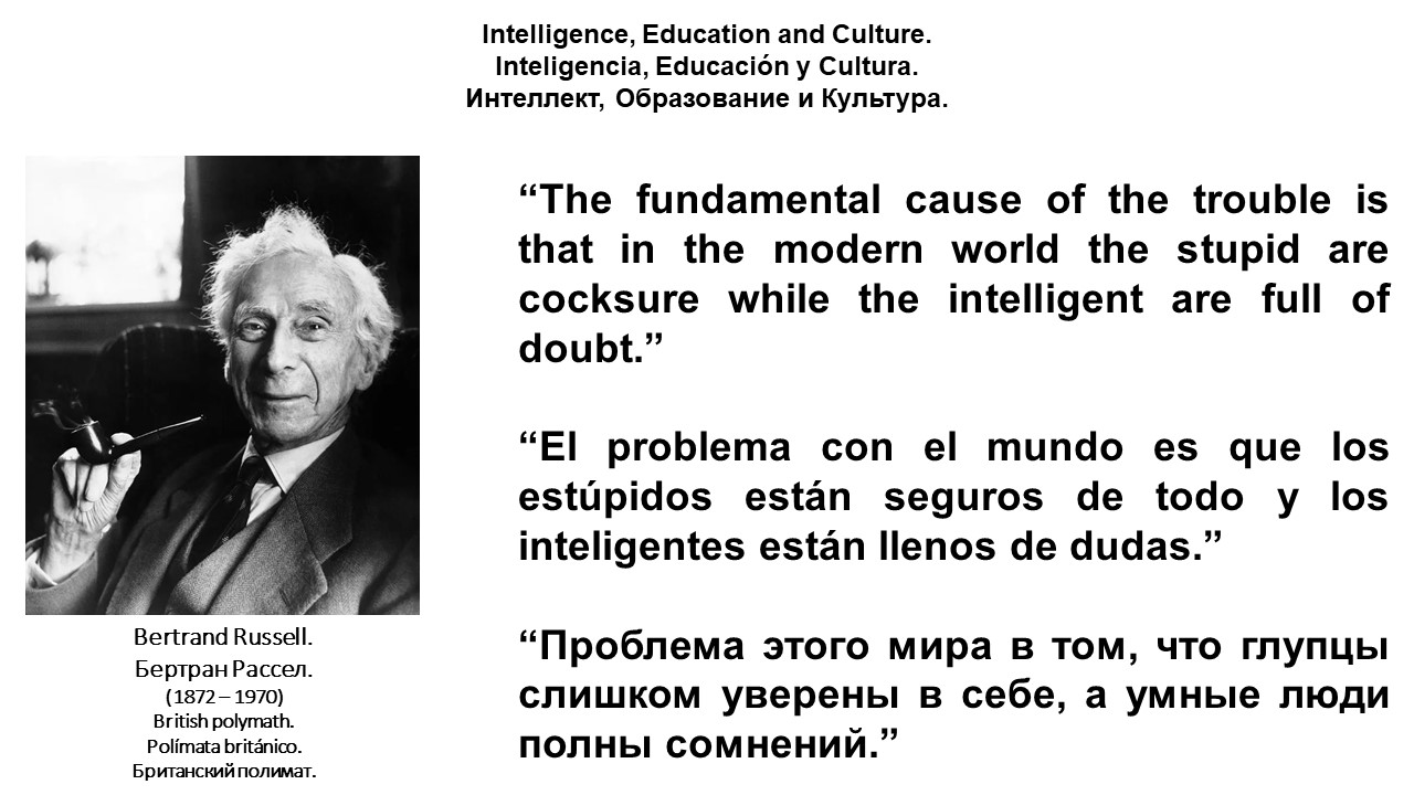 Fernando Antonio Ruano Faxas. Intelligence, Education, Culture. Bertrand Russell, Бертран Рассел. The fundamental cause of the trouble is that in the modern world the stupid are cocksure while the intelligent are full of doubt