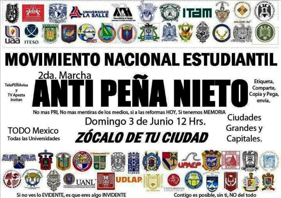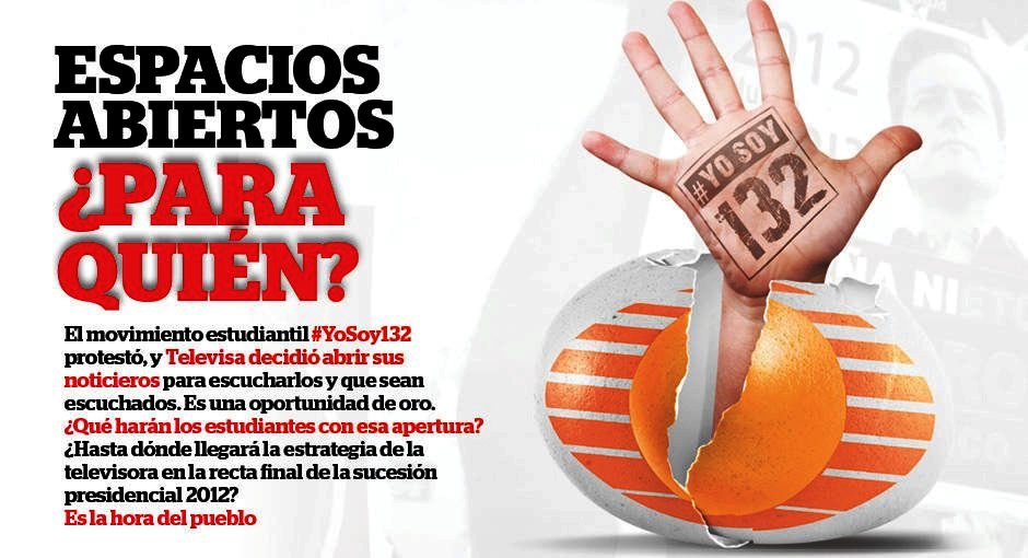 «Un total de 24 millones de jóvenes menores de 29 años forman parte del censo electoral, y 14 millones nunca han votado en unas elecciones presidenciales. De pronto estos números han cobrado vida e irrumpido en la campaña electoral mexicana con una fuerza nunca vista. Son los enojados, los engañados, los ignorados, los estudiantes, sobre todo, de las universidades privadas que, hartos de una democracia devaluada, se han echado a la calle para protestar contra la corrupción, los partidos políticos y la “manipulación” informativa de las grandes cadenas de televisión. El detonante que ha puesto en marcha una cadena de manifestaciones -la próxima este miércoles- estalló el pasado día 11, cuando el candidato presidencial del Partido Revolucionario Institucional (PRI), Enrique Peña Nieto, acudió a un acto de campaña en la Universidad Iberoamericana, fundada por los jesuitas y situada en una de las zonas más exclusivas de la capital mexicana. Los estudiantes pronto se cansaron de las vaguedades del político y comenzaron a reprocharle su gestión como gobernador del Estado de México. Sin posibilidad de réplica, Peña Nieto acabó huyendo entre gritos de “¡fuera, fuera!” y “¡asesino!”. El PRI reaccionó acusando a los universitarios de dejarse manipular por un grupo de provocadores e infiltrados. Televisa, la cadena con mayor audiencia y a la que se acusa de apoyar al líder priísta, solo dio una versión de los hechos favorable al viejo partido hegemónico […] Los jóvenes han entrado en la campaña y reclaman un cambio, convirtiéndose en una suerte de quinto poder. Y de momento van ganando. Televisa emitió por primera vez en la mañana del lunes, diez días después de los incidentes, nueve minutos sobre lo que ocurrió en la Universidad Iberoamericana»