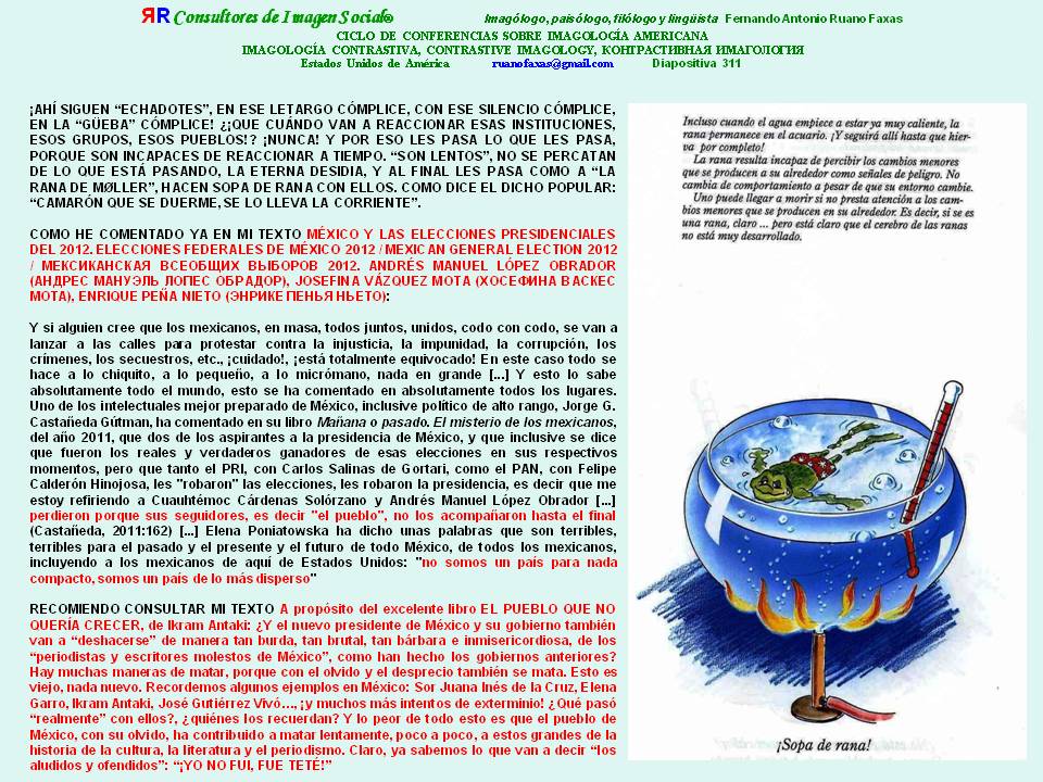 […] Esta barbaridad, esta barbarie, de #TLATLAYA, en el Estado de México […] es en el panorama sangriento de México un “¡Qué tanto es tantito!” […] MÉXICO: MASACRES EN ACTEAL, CHERÁN, COPALA, COCHOAPA EL GRANDE, METLATÓNOC, ACATEPEC, TEHUIPANGO, SANTA MARÍA CHILCHOTLA… ¡TODO MÉXICO HA SIDO Y ES UN HOLOCAUSTO, UN GENOCIDIO! ¡HASTA CUÁNDO! […] Como dijera ya Eulalio Gutiérrez, que fue presidente de México entre 1914 y 1915, y que repitiera el excelente escritor Andrés Henestrosa: “EL PAISAJE MEXICANO HUELE A SANGRE” […] ¿Y quiénes hablan sinceramente acerca de lo que ha pasado y sigue pasando en México? ¿Los periodistas? ¿Los medios? ¿Cuáles? ¿Dónde? Y si lo hacen, éstos son muy pocos. Son los valientes, los arriesgados. ¿Por qué? Olviden ya esto de “chayoteros” y “embuteros”, eso ya no tiene caso analizarlo aquí, es “caso perdido”, son abrumadora mayoría. El asunto radica en lo que en México les hacen a los periodistas, a los comunicadores y los medios que se atreven a “hablar”. ¿No recuerdan ustedes las palabras de Elena Poniatowska? “En México decir la verdad es jugarse la vida”, “Estamos bocabajeados, muy divididos. México está sin fe”, “No somos un país para nada compacto, somos un país de lo más disperso” […] Los discursos, las comunicaciones, en México, se producen como si los usuarios de la lengua que está establecida en el país como idioma oficial, es decir el idioma español, estuvieran dentro de la novela llamada Epepe o Metropole, del autor Ferenc Karinthy, es decir “nadie nunca entendió a nadie” […] En México, salvo casos contados, se cantinflea acerca de absolutamente todo, y sobre todo y en especial en el ámbito de la política, los verdaderos problemas de México y los mexicanos y los derechos humanos […] ¿Qué hasta dónde ha llegado México en cuanto a Derechos Humanos? Nunca en la vida había oído que a un ombudsman lo quisieran llevar a juicio, que quisieran enjuiciarlo, llevarlo a los tribunales. ¿¡Pero qué cosa es ésa!? Pues esto es lo quieren hacer muchos grupos y personalidades influyentes de México con Raúl Plascencia Villanueva, que es hoy el Presidente de la Comisión Nacional de los Derechos Humanos de México. ¿Se imaginan ustedes los alcances de esto? Y DESPUÉS ME PREGUNTAN QUE POR QUÉ LLAMO A MÉXICO “EL GRAN TRONO UNIVERSAL E INDISCUTIBLE DEL REALISMO MÁGICO LATINO” […] En México puede pasar todo, hasta tener su Papa particular: México es, a saber, el único país de América que ha tenido, al mismo tiempo, dos “patriarcas”, dos “papas”, dos “cabezas de la Iglesia católica” –en este caso, una en Roma y otra en México. En 1926, mientras regía como papa en el Vaticano Pío XI –italiano de nacimiento, cuyo nombre era Archille Ratti, que fue papa entre 1922 y 1939–, el general y presidente mexicano Plutarco Elías Calles nombró “Patriarca” al cura oaxaqueño José Joaquín Pérez Budar, luego de un conflicto que se produjo en el seno de la Iglesia católica mexicana a partir de febrero de 1925: “En octubre de 1926, el Patriarca Pérez fue consagrado Primado de los Viejos Cristianos para América del Norte” […] Cantinflear, cantinfleo, cantinflada, es algo que he definido como el ESTADO DEL PAPALOTEO MENTAL, PAPALOTEAR MENTALMENTE […] En el lenguaje verbal y en el lenguaje corporal de los mexicanos, en general y en cualquier contexto, tal pareciera que por encima de la precisión siempre imperará la imprecisión: nunca un “el”, nunca un “la”, nunca un “los”, nunca un “ese”, nunca un “esa”, nunca un “esos”, y siempre un “un”, un “una”, un “unos” […] es algo así como un “sí, pero no” y un “no, pero sí”… Como decía Antaki: siempre lo general y confuso: “flor y fruta”, nunca lo particular y claro: “jacaranda y ciruela”. ¿Y por qué siempre “lo general”? Muy sencillo, porque a los mexicanos no les enseñan “lo particular”. Les enseñan a dar rodeos para todo, y lo directo se ve como feo, como grosero, como no mexicano, aunque todos sabemos lo que hay verdaderamente detrás de todo esto: “las máscaras mexicanas que tanto daño le han hecho a México y a los mexicanos, y también, de paso, a los países extranjeros y a los extranjeros”: mentir y mentir y mentir […] Hay unas palabras de Vasconcelos (casi un apóstol o un apóstol para muchos mexicanos) que para mí siempre serán terribles, nunca he visto ni oído tales palabras, ni semejantes, en un líder para referirse a su pueblo: “Este pueblo mexicano no merece que yo sacrifique una sola hora de mi sueño. ¡Es un pueblo de traidores y de cobardes que no me merece! Demasiado he hecho por redimirlo. No volveré a ocuparme de él” […] cuando me preguntan que cómo defino imagológicamente a México, un país “tan rico y tan pobre”, lo que digo es que ya lo que creo es que “México es como el ole, que no tiene explicación…” […] Creo que quien mejor ha definido la vida de los mexicanos dentro de México ha sido Carlos Fuentes: “Eres quien eres porque supiste chingar y no te dejaste chingar; eres quien eres porque no supiste chingar y te dejaste chingar” […]