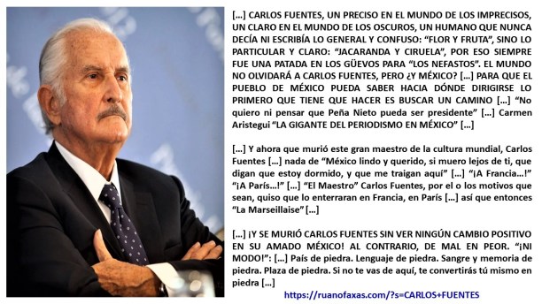 […] ¡Y SE MURIÓ CARLOS FUENTES SIN VER NINGÚN CAMBIO POSITIVO EN SU AMADO MÉXICO! AL CONTRARIO, DE MAL EN PEOR. “¡NI MODO!”: […] País de piedra. Lenguaje de piedra. Sangre y memoria de piedra. Plaza de piedra. Si no te vas de aquí, te convertirás tú mismo en piedra […]