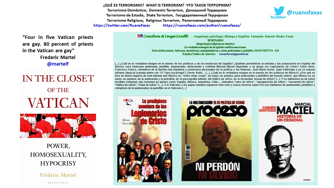 Fernando Antonio Ruano Faxas. IN THE CLOSET OF THE VATICAN. POWER, HOMOSEXUALITY, HYPOCRISY. Frederic Martel. LA PRODIGIOSA AVENTURA DE LOS LEGIONARIOS DE CRISTO. Alfonso Torres Robles. PEDERASTIA, PEDOFILIA, VATICANO, MACIEL