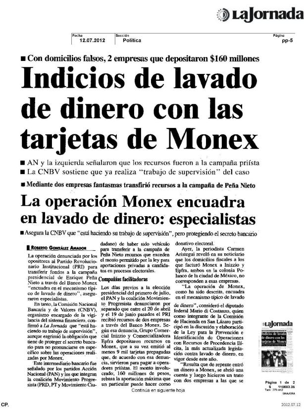 Este asunto de se va complicando más tanto en Estados Unidos http://www.scribd.com/doc/98261832/Demanda-de-Jose-Aquino-a-Alejandro-Carrillo-Garza-Sada como en México. Ahora en México ha aparecido otro problema relacionado con los 56 millones de dólares que, al parecer, el PRI “le voló” (le robó) al empresario mexicano-estadounidense José Luis Ponce de Aquino, y se trata de la relación del PRI con Banco Monex o Grupo Financiero Monex http://aristeguinoticias.com/las-43-facturas-de-presuntos-gastos-del-pri-en-tarjetas-monex-parte1/ , http://aristeguinoticias.com/caso-aquino-monex-pri-los-puntos-clave-y-los-documentos/ , http://www.proceso.com.mx/?p=312287 , http://www.reforma.com/elecciones/articulo/662/1323976/ […] “EN MONEX… HAY GATO ENCERRADO” http://www.reporteindigo.com/reporte/mexico/en-monex-hay-gato-encerrado […] http://www.proceso.com.mx/?p=312483 , http://www.reforma.com/editoriales/nacional/663/1324521/ , http://www.sinembargo.mx/28-06-2012/279083 [..] Claro, miren este ejemplo de cómo el PRI y sus “funcionarios” han negado mil veces lo de #Monex https://www.youtube.com/watch?feature=player_embedded&v=B5cguWTjMxY ; pero resulta que, “¡para variar!”, “siempre sí”, siempre sí existió la “tranza” de Monex, ¡y a lo grande!: ¡50 millones de pesos! http://www.noticiasmvs.com/#!/noticias/ife-preve-sumar-50mdp-de-monex-a-los-gastos-de-campana-de-epn-893.html , http://www.noticiasmvs.com/#!/noticias/prd-ante-el-ife-se-inconforma-por-trabajo-de-unidad-de-fiscalizacion-388.html […] “Peña ganó a billetazos” http://aristeguinoticias.com/2101/mexico/falto-seriedad-en-investigacion-del-ife-por-caso-monex-prd/ […]