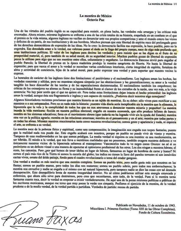 “Muchos pueblos gozan de libertad de expresión, pocos la utilizan para algo que no sea mentirse entre ellos, calumniarse y engañarse […] nuestra historia es un tejido de mentiras […] ¡nuestra vida diaria sería inexplicable sin la mentira que la alimenta, la hipocresía que la vela y la complicidad de todos los que no nos atrevemos a denunciar nuestra miseria y pequeñez! La mentira inunda la vida mexicana: ficción es nuestra política electoral […] mentira por todas partes y en todas las almas […] somos gesto y apariencia y nada […] una verdad a medias es más nociva que una mentira completa” (Octavio Paz, La mentira de México, 1943)
