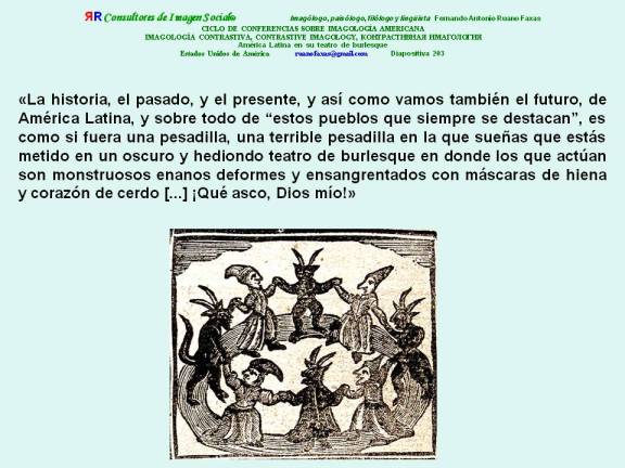 «La historia, el pasado, y el presente, y así como vamos también el futuro, de América Latina, y sobre todo de “estos pueblos que siempre se destacan”, es como si fuera una pesadilla, una terrible pesadilla en la que sueñas que estás metido en un oscuro y hediondo teatro de burlesque en donde los que actúan son monstruosos enanos deformes y ensangrentados con máscaras de hiena y corazón de cerdo […] ¡Qué asco, Dios mío!»