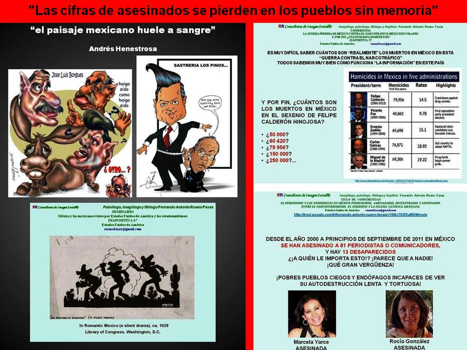 […] Y volvemos a la terrible pregunta de siempre: “¿Los mexicanos nunca acabarán su guerra fratricida, su lucha de autoexterminio?” Y volvemos a la terrible respuesta de siempre: “¡Pues sí, el autoexterminio de los mexicanos será eterno, y sólo se salvarán los que logren salir de México!” […] ¿Acaso eso no es lo que hemos visto y seguimos viendo, por décadas, por siglos? Si hay dudas al respecto, ¡qué les pregunten a los 31 millones de mexicanos que viven aquí en Estados Unidos! […] Como hemos dicho ya mil veces «A México lo ha matado el PRI, y el tiro de gracia se lo ha dado el PAN. Y si hubiera alguna oportunidad de resucitar, el fanatismo, la ignorancia y el analfabetismo nunca lo permitirían. “Ni modo” “¡Aquí nos tocó vivir!”» […] La terrible situación que está viviendo México hoy en absolutamente todos los sentidos no nos permite el lujo de tardarnos más en cuanto a tomar decisiones tajantes en relación con el presente y el futuro del país y las nuevas generaciones. No podemos permitir que México siga siendo un cementerio clandestino, una fosa común. No podemos aceptar esta terrible realidad en la que México ha dejado de sembrar maíz para sembrar cadáveres. No hay un sólo lugar de este país en donde se meta una pala y no salgan cadáveres […] ¿Es que acaso todavía no hemos visto que hay regiones y países que en tiempos y en la actualidad más que llamarse “regiones” y “países”, por la causa que sea, deberían ser llamados “regiones-morgues”, “países-morgues”? ¡Han sido y son en esos lugares tantos los muertos! Hay regiones y países en donde, “antes o ahora” y “antes y ahora”, la cultura diaria de la vida es, sencillamente, la cultura diaria de la muerte […] Ni se ha sabido nunca ni se sabrá nunca cuántos han sido los muertos, los asesinados, los masacrados, en México. Los muertos no hablan. Y los presidentes mexicanos y “sus camarillas”, después que masacran y roban, se van de México, por lo menos por un buen tiempo, y las potencias del mundo los reciben “con los brazos abiertos”. ¡Qué bonito…! […] ¿¡Que cuándo va a cambiar a México!? ¡Nunca…! Sencillamente miren este presente mexicano, igual o peor que el pasado. ¡Y eso lo ha decidido el mismo pueblo de México, el mismo pueblo mexicano que está dentro de México y el mismo pueblo mexicano que está aquí en Estados Unidos, esos 31 millones de mexicanos que viven aquí en USA, y lo han decidido en las urnas, con sus elecciones presidenciales, con sus votaciones, con sus votos, y con sus abtenciones! Entonces, como se dice “por ahí”: “¡provecho…!” […]