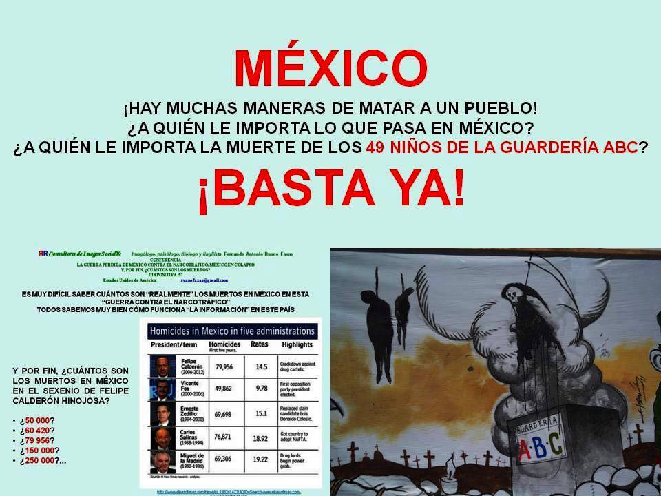 MÉXICO: ¡HAY MUCHAS MANERAS DE MATAR A UN PUEBLO! ¿A QUIÉN LE IMPORTA LO QUE PASA EN MÉXICO? ¿A QUIÉN LE IMPORTA LA MUERTE DE LOS 49 NIÑOS DE LA GUARDERÍA ABC? ¡BASTA YA! https://ruanofaxas.wordpress.com/2012/06/05/mexico-hay-muchas-maneras-de-matar-a-un-pueblo-a-quien-le-importa-lo-que-pasa-en-mexico-a-quien-le-importa-la-muerte-de-los-49-ninos-de-la-guarderia-abc-basta-ya/