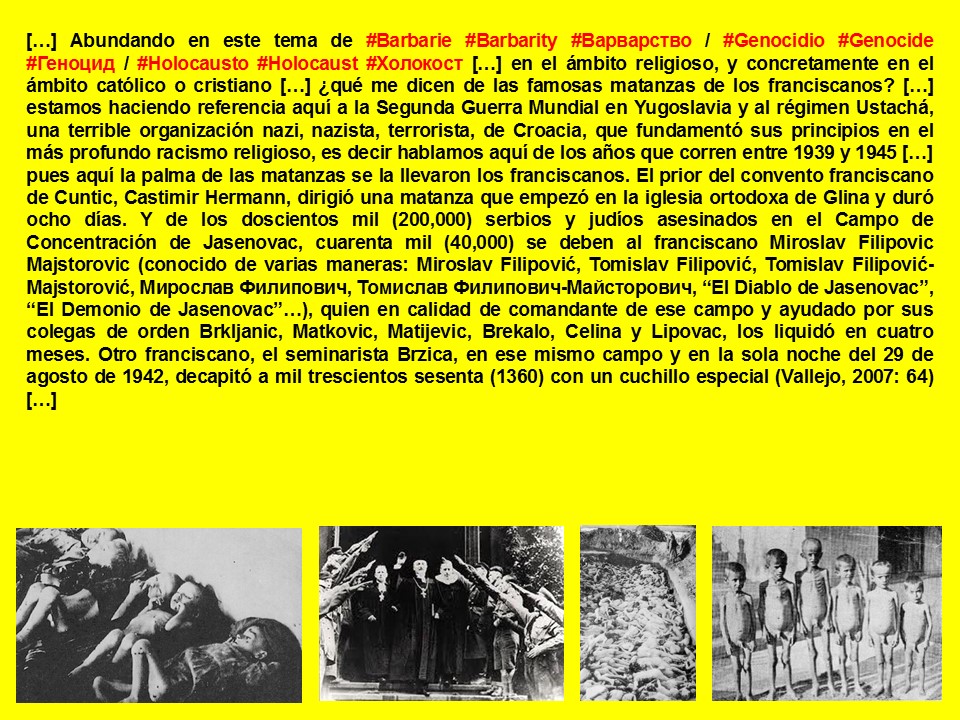 […] Abundando en este tema de #Barbarie #Barbarity #Варварство / #Genocidio #Genocide #Геноцид / #Holocausto #Holocaust #Холокост […] en el ámbito religioso, y concretamente en el ámbito católico o cristiano […] ¿qué me dicen de las famosas matanzas de los franciscanos? […] estamos haciendo referencia aquí a la Segunda Guerra Mundial en Yugoslavia y al régimen Ustachá, una terrible organización nazi, nazista, terrorista, de Croacia, que fundamentó sus principios en el más profundo racismo religioso, es decir hablamos aquí de los años que corren entre 1939 y 1945 […] pues aquí la palma de las matanzas se la llevaron los franciscanos. El prior del convento franciscano de Cuntic, Castimir Hermann, dirigió una matanza que empezó en la iglesia ortodoxa de Glina y duró ocho días. Y de los doscientos mil (200,000) serbios y judíos asesinados en el Campo de Concentración de Jasenovac, cuarenta mil (40,000) se deben al franciscano Miroslav Filipovic Majstorovic (conocido de varias maneras: Miroslav Filipović, Tomislav Filipović, Tomislav Filipović-Majstorović, Мирослав Филипович, Томислав Филипович-Майсторович, “El Diablo de Jasenovac”, “El Demonio de Jasenovac”…), quien en calidad de comandante de ese campo y ayudado por sus colegas de orden Brkljanic, Matkovic, Matijevic, Brekalo, Celina y Lipovac, los liquidó en cuatro meses. Otro franciscano, el seminarista Brzica, en ese mismo campo y en la sola noche del 29 de agosto de 1942, decapitó a mil trescientos sesenta (1360) con un cuchillo especial (Vallejo, 2007: 64) […] https://ruanofaxas.wordpress.com/article/sexo-pederastia-paidofilia-pedofilia-19j6x763f3uf8-19-2/ , http://knol.google.com/k/fernando-antonio-ruano-faxas/sexo-pederastia-paidofilia-pedofilia/19j6x763f3uf8/19# […] Claro, según los tiempos y los espacios, según los tipos de dictaduras, según los tipos de tiranías, según los tipos de “democracias raras”, acerca de los campos de concentración se ha contado lo que se ha querido contar, e incluso a veces ha sido tan poco lo que se ha contado que inmensas masacres, masacres terribles, han sido borradas de la mente de los seres humanos, han sido borradas de las mentes de, inclusive, los que son llamados “intelectuales” […] ¿Quién habla del #Holodomor #Golodomor #Голодомор de #Ucrania #Ukraine #Украина? https://twitter.com/ruanofaxas/status/492318311346999296 […] ¿Cuántos ucranianos fueron “exterminados”?, ¿7 millones, 8 millones, 9 millones o 10 millones? A estas alturas, ¡quién sabe! […] De Ucrania he hablado en otros momentos: https://ruanofaxas.com/?s=Ucrania, https://twitter.com/search?q=%22Ucrania%22%20(%40RuanoFaxas)&src=typed_query&f=live, https://twitter.com/search?f=live&q=%22Ukraine%22%20(%40RuanoFaxas)&src=typed_query […]