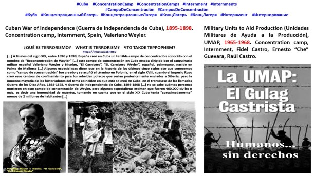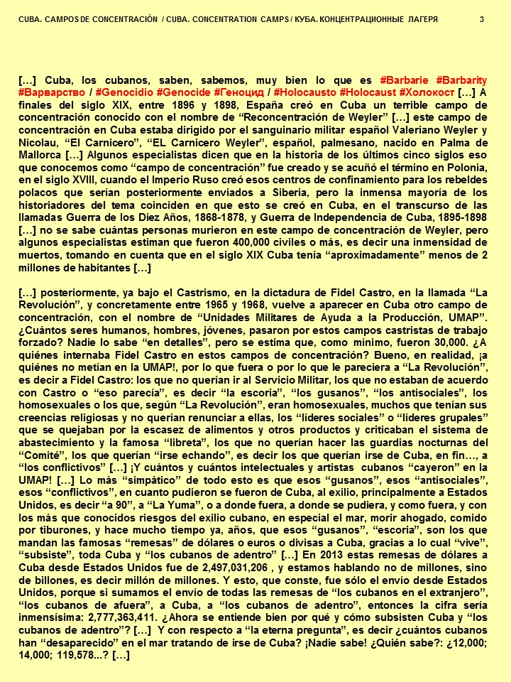 […] Cuba, los cubanos, saben, sabemos, muy bien lo que es #Barbarie #Barbarity #Варварство / #Genocidio #Genocide #Геноцид / #Holocausto #Holocaust #Холокост […] A finales del siglo XIX, entre 1896 y 1898, España creó en Cuba un terrible campo de concentración conocido con el nombre de “Reconcentración de Weyler” […] este campo de concentración en Cuba estaba dirigido por el sanguinario militar español Valeriano Weyler y Nicolau (Валериано Вейлер и Николау), “El Carnicero”, “EL Carnicero Weyler”, español, palmesano, nacido en Palma de Mallorca […] Algunos especialistas dicen que en la historia de los últimos cinco siglos eso que conocemos como “campo de concentración” fue creado y se acuñó el término en Polonia, en el siglo XVIII, cuando el Imperio Ruso creó esos centros de confinamiento para los rebeldes polacos que serían posteriormente enviados a Siberia, pero la inmensa mayoría de los historiadores del tema coinciden en que esto se creó en Cuba, en el transcurso de las llamadas Guerra de los Diez Años, 1868-1878, y Guerra de Independencia de Cuba, 1895-1898 […] no se sabe cuántas personas murieron en este campo de concentración de Weyler, pero algunos especialistas estiman que fueron 400,000 civiles o más, es decir una inmensidad de muertos, tomando en cuenta que en el siglo XIX Cuba tenía “aproximadamente” menos de 2 millones de habitantes […] Acerca de las terribles historias de los campos de concentración creados por el criminal alemán Adolf Hitler (Adolfo Hitler) en la Alemania nazi, entre 1933 y 1945, he hablado con frecuencia, y en especial he hablado de dos de esos campos de concentración, Dachau, que fue el que se creó primero, en Alemania, en la ciudad que lleva el mismo nombre, cerca de Múnich, en marzo 1933, y Auschwitz (que en realidad no era solamente un solo campo de concentración, sino que era un complejo, un grupo, de más de 40 campos de concentración y exterminio operados por la Alemania nazi en la Polonia ocupada), el más terrible y tristemente famoso, creado en Polonia, en la ciudad de Oświęcim (Освенцим), en mayo de 1940 […] “Desde 1933 hasta 1945, la Alemania nazi operó más de mil campos de concentración en su propio territorio y en partes de la Europa ocupada por la Alemania nazi” […] “Dachau, el primer campo de concentración nazi, abrió sus puertas en 1933, poco después de que Adolf Hitler se convirtiera en canciller de Alemania. Ubicado en el sur de Alemania, Dachau fue inicialmente un campo para prisioneros políticos, pero finalmente se convirtió en un campo de exterminio donde miles de judíos murieron por desnutrición, enfermedades y exceso de trabajo, o fueron ejecutados. Además de judíos, los prisioneros del campo incluían artistas, intelectuales, discapacitados físicos y mentales, romaníes (gitanos), homosexuales, religiosos que según los nazis eran una amenaza para Alemania, como testigos de Jehová, sacerdotes católicos y creyentes de otras sectas” […]