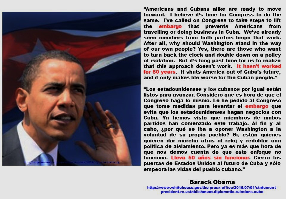 “Los estadounidenses y los cubanos por igual están listos para avanzar. Considero que es hora de que el Congreso haga lo mismo. Le he pedido al Congreso que tome medidas para levantar el embargo que evita que los estadounidenses hagan negocios con Cuba. Ya hemos visto que miembros de ambos partidos han comenzado este trabajo. Al fin y al cabo, ¿por qué se iba a oponer Washington a la voluntad de su propio pueblo? Sí, están quienes quieren dar marcha atrás al reloj y redoblar una política de aislamiento. Pero ya es más que hora de que nos demos cuenta de que este enfoque no funciona. Lleva 50 años sin funcionar. Cierra las puertas de Estados Unidos al futuro de Cuba y sólo empeora las vidas del pueblo cubano.”