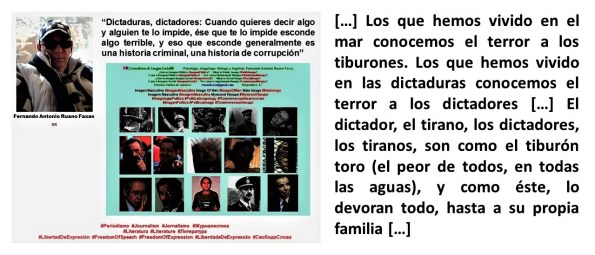 […] Los que hemos vivido en el mar conocemos el terror a los tiburones. Los que hemos vivido en las dictaduras conocemos el terror a los dictadores […] El dictador, el tirano, los dictadores, los tiranos, son como el tiburón toro (el peor de todos, en todas las aguas), y como éste, lo devoran todo, hasta a su propia familia […]