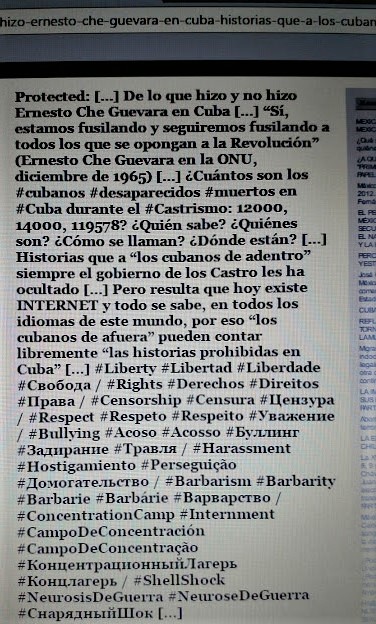 […] De lo que hizo y no hizo Ernesto Che Guevara en Cuba […] “Sí, estamos fusilando y seguiremos fusilando a todos los que se opongan a la Revolución” (Ernesto Che Guevara en la ONU, diciembre de 1965) […] ¿Cuántos son los #cubanos #desaparecidos #muertos en #Cuba durante el #Castrismo: 12000, 14000, 119578? ¿Quién sabe? ¿Quiénes son? ¿Cómo se llaman? ¿Dónde están? […] Historias que a “los cubanos de adentro” siempre el gobierno de los Castro les ha ocultado […] Pero resulta que hoy existe INTERNET y todo se sabe, en todos los idiomas de este mundo, por eso “los cubanos de afuera” pueden contar libremente “las historias prohibidas en Cuba” […] #Liberty #Libertad #Liberdade #Свобода / #Rights #Derechos #Direitos #Права / #Censorship #Censura #Цензура / #Respect #Respeto #Respeito #Уважение / #Bullying #Acoso #Acosso #Буллинг #Задирание #Травля / #Harassment #Hostigamiento #Perseguição #Домогательство / #Barbarism #Barbarity #Barbarie #Barbárie #Варварство / #ConcentrationCamp #Internment #CampoDeConcentración #CampoDeConcentração #КонцентрационныйЛагерь #Концлагерь / #ShellShock #NeurosisDeGuerra #NeuroseDeGuerra #СнарядныйШок […]