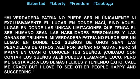 “MI VERDADERA PATRIA NO PUEDE SER NI ÚNICAMENTE NI EXCLUSIVAMENTE EL LUGAR EN DONDE NACÍ, SINO AQUEL LUGAR EN DONDE LAS ÚNICAS LIMITACIONES QUE TENGA EL SER HUMANO SEAN LAS HABILIDADES PERSONALES Y LAS GANAS DE TRIUNFAR. MI VERDADERA PATRIA NO PUEDE SER UN LUGAR EN DONDE LOS SUEÑOS DE UNOS SEAN LAS PESADILLAS DE OTROS. ALLÍ POR SOÑAR NO MATAN; PERO SÍ MATAN EN CUANTO CONOCEN TUS SUEÑOS. ¡CUIDADO CON CONTAR LOS SUEÑOS ALLÍ! PUEDES LLAMARME LOCO, PERO ME GUSTA VER A LOS DEMÁS FELICES Y TENIENDO ÉXITO. CALL ME CRAZY BUT I LOVE TO SEE OTHER PEOPLE HAPPY AND SUCCEEDING.”