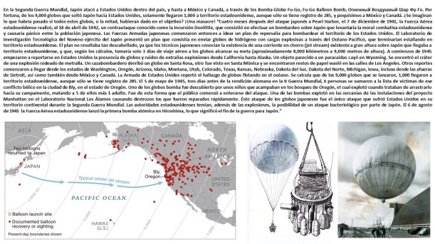 […] En la Segunda Guerra Mundial, Japón atacó a Estados Unidos dentro del país, y hasta a México y Canadá, a través de los Bomba Globo Fu-Go, Fu-Go Balloon Bomb, Огненный Воздушный Шар Фу-Го. Por fortuna, de los 9,000 globos que soltó Japón hacia Estados Unidos, solamente llegaron 1,000 a territorio estadounidense, aunque sólo se tiene registro de 285, y poquísimos a México y Canadá. ¿Se imaginan lo que habría pasado si todos estos globos, o la mitad, hubieran dado en el objetivo? ¡Una masacre! “Cuatro meses después del ataque japonés a Pearl Harbor, el 7 de diciembre de 1941, la Fuerza Aérea estadounidense realizó, el 18 de abril de 1942, un contraataque conocido como la Incursión Doolittle, que consistió en efectuar un bombardeo sobre Japón que levantaría la moral combativa estadounidense y causaría pánico entre la población japonesa. Las Fuerzas Armadas japonesas comenzaron entonces a idear un plan de represalia para bombardear el territorio de los Estados Unidos. El Laboratorio de Investigación Tecnológica del Noveno ejército del Japón presentó un plan que consistía en enviar globos de hidrógeno con cargas explosivas a través del Océano Pacífico, que terminarían estallando en territorio estadounidense. El plan no resultaba tan descabellado, ya que los técnicos japoneses conocían la existencia de una corriente en chorro (jet stream) existente a gran altura sobre Japón que llegaba a territorio estadounidense, y que, según los cálculos, tomaría solo 3 días de viaje aéreo a los globos alcanzar su meta (aproximadamente 8,000 kilómetros a 9,000 metros de altura). A comienzos de 1945 empezaron a reportarse en Estados Unidos la presencia de globos y ruidos de extrañas explosiones desde California hasta Alaska. Un objeto parecido a un paracaídas cayó en Wyoming. Se encontró el cráter de una explosión rodeado de metralla. Un cazabombardero derribó un globo en Santa Rosa, otro fue visto en Santa Mónica y se encontraron restos de papel washi en las calles de Los Ángeles. Otros reportes comenzaron a llegar desde los estados de Washington, Oregón, Arizona, Idaho, Montana, Utah, Colorado, Texas, Kansas, Nebraska, Dakota del Sur, Dakota del Norte, Míchigan, Iowa, incluso desde las afueras de Detroit, así como también desde México y Canadá. La Armada de Estados Unidos reportó el hallazgo de globos flotando en el océano. Se calcula que de los 9,000 globos que se lanzaron, 1,000 llegaron a territorio estadounidense, aunque sólo se tiene registro de 285. El 5 de mayo de 1945, tres días antes de la rendición alemana en la II Guerra Mundial, 6 personas se sumaron a la lista de víctimas de ese conflicto bélico en la ciudad de Bly, en el estado de Oregón. Uno de los globos bomba fue descubierto por unos niños que acampaban en los bosques de Oregón, el cual explotó cuando trataban de arrastrarlo hacia su campamento, matando a 5 de ellos más 1 adulto. Fue de esta forma que el público comenzó a enterarse del ataque. Una de las bombas explotó en las cercanías de las instalaciones del proyecto Manhattan en el Laboratorio Nacional Los Álamos causando destrozos los que fueron reparados rápidamente. Éste ataque de los globos japoneses fue el único ataque que sufrió Estados Unidos en su territorio continental durante la Segunda Guerra Mundial. Las autoridades estadounidenses temían, además de las explosiones, la posibilidad de un ataque bacteriológico por parte de Japón. El 6 de agosto de 1945 la Fuerza Aérea estadounidense lanzó la primera bomba atómica en Hiroshima, lo que significó el fin de la guerra para Japón.” […]