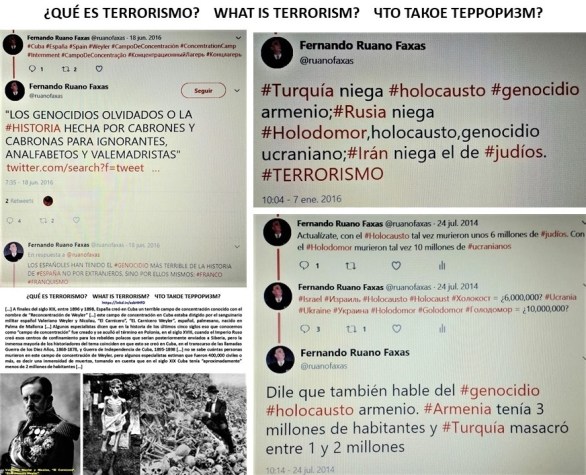 […] Y como siempre digo, “EN CUANTO A CRÍMENES CONTRA LA HUMANIDAD O CRÍMENES DE LESA HUMANIDAD, CRÍMENES ATROCES MASIVOS, CRÍMENES DE GUERRA, EN CUANTO A LOS CULPABLES DE LOS GENOCIDIOS Y LOS HOLOCAUSTOS Y SUS CÓMPLICES, EN CUANTO A LOS CRÍMENES BAJO DICTADURAS Y TIRANÍAS, O CUALQUIER OTRA FORMA DE PERSECUCIÓN, ESCLAVITUD Y SOMETIMIENTO, SEA DONDE SEA, NI PERDÓN NI OLVIDO, “OJO POR OJO, DIENTE POR DIENTE” […] Acerca de los términos “campo de concentración”, “holocausto”, “genocidio”, “internment”… y sus significados tal pareciera que algunos grupos humanos, como es el caso de algunos judíos e Israel, quieren tener el monopolio de ellos, es decir que piensan que estos términos y sus significados les pertenecen a ellos exclusivamente, y que las demás personas tienen que pedirles permiso para emplearlos y que ellos decidirán si esto es posible o no. Literalmente hablando, ¡que no jodan!, ¡qué aterricen!, y que antes de estar hablando estupideces revisen un poco acerca de la historia. En cuanto a #analfabetismo funcional #AnalfabetismoFuncional, como ya hemos visto y seguimos viendo, esto sigue a la orden del día, ¡y eso que hace mucho tiempo ya que existe Internet! En cuanto a los problemas que se presentan en las ciencias sociales para tratar los términos y sus significados llevo hablando más de 40 años […] TERMINOLOGÍA, TERMINOGRAFÍA, TÉRMINOS. TÉRMINOS CIENTÍFICOS Y TÉCNICOS, VOCABULARIOS ESPECIALIZADOS, PALABRAS ESPECIALIZADAS, NOMENCLATURA, NOMENA, COMBINACIÓN DE PALABRAS, FUENTES DE LOS TÉRMINOS. […] En las ciencias sociales los términos, las palabras especializadas, y sus significados no funcionan como en las ciencias naturales, las ciencias exactas y las ciencias formales. En las ciencias sociales la terminología no es en blanco y negro y ya, no es un dos y dos son cuatro, aquí la variedad de matices de los significados de un mismo término, según el tiempo y la geografía, es decir los países, las culturas, las políticas, pueden crear problemas muy serios de entendimiento, de comprensión, de comunicación, si no se conoce el terreno que se está tratando. En las ciencias sociales la terminología, los términos, sus significados funcionan como decía el profesor Christopher C. Joyner: “Terrorismo es como la pornografía: lo reconoces al verlo, pero es imposible llegar a una definición aceptada universalmente” […]