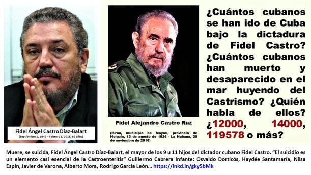 […] ¡Hasta hijos y nietos de Fidel Castro Ruz han huido de Cuba!, como es el caso de dos de sus hijas, que viven aquí en Estados Unidos: Francisca Cardosa (Castro) Pupo, que hoy tiene 70 años, y Alina Fernández (Castro) Revuelta, que hoy tiene 67 años, aparte de dos hermanas: la cuarta de los 7 hermanos Castro Ruz, Juana de la Caridad Castro Ruz, que vive aquí en Estados Unidos, Florida, Miami, y la penúltima de los hermanos Castro Ruz, Enma de la Concepción Castro Ruz, que vive en México. Recordemos que Fidel Castro tiene en total 11 hermanos, es decir, 6 hermanos Castro Ruz, es decir los hijos nacidos de su padre Ángel Castro Argiz “en unión” con su madre, la cubana Lina Ruz González, y además 5 hermanos Castro-Argota, hijos de su padre con su primera esposa, en su primer matrimonio, con la cubana María Luisa Argota Reyes, que era maestra en el pueblo de Birán, y quien fue la que enseñó a leer y escribir al padre de Fidel, que era un español analfabeto […] Fidel Castro tiene varios sobrinos y sobrinas que han logrado escapar de Cuba y que ahora viven en el extranjero, en Estados Unidos y México, y hasta nietos del dictador “se fueron echando de Cuba”: “Al menos 5 de los nietos de Fidel Castro, tras cursar sus carreras en la Universidad de La Habana, se han formado como científicos y técnicos con becas de posgrado en centros públicos españoles. Tres se quedaron a vivir en España y llevan una vida normal” […] Fidel Castro Ruz, el dictador cubano, tuvo, a saber, 9 hijos “conocidos” con 5 mujeres […] La historia del padre de Fidel Castro es “larga, rara, complicada, confusa”: […] Ángel María Bautista Castro y Arguiz (Láncara, Lugo, Galicia, España, 4 de diciembre de 1875 – Birán, Cueto, provincia de Holguín, Cuba, 21 de octubre de 1956, 80 años), campesino español analfabeto, que ingresó en el ejército en su país natal, sustituyendo a otro reclutado que le pagó a él para que ocupara su puesto para así evadir el reclutamiento militar español, es decir un desertor, lo mismo que hizo en Alemania el abuelo de Donald Trump, es decir Frederick Trump (nacido como Friedrich Drumpf) https://ruanofaxas.com/?s=Drumpf , y así entonces el padre de Fidel Castro formó parte del ejército español destacado en Cuba, que peleó contra los mambises en la Guerra de Independencia de 1895, y en la Guerra hispano-estadounidense […] Volvió a España con el ejército español derrotado en 1898, y regresó a Cuba en diciembre de 1899 en busca de fortuna. Excelente jugador de cartas, barajas, tuvo muy buena intuición en los negocios y llegó a trabajar como contratista con la United Fruit Company cortando madera en los bosques, para luego plantar inmediatamente caña de azúcar. Además, de forma particular, se dedicaba a la crianza de gallos jerezanos de pelea, lo que le comenzó a generar muy buen dinero. Las ganancias de aquel negocio las invirtió comprando terrenos en el campo de Birán. Después fundó en él su propia hacienda, Las Manacas, consiguiendo así el éxito económico y convirtiéndose finalmente en un rico terrateniente en la parte septentrional de la por entonces (hasta 2010) provincia de Oriente, y hoy provincia de Holguín. Fue propietario de 1800 hectáreas, y arrendó otras 10000. Tuvo 300 – 400 obreros agrícolas, muchos de ellos haitianos, trabajando en su hacienda. Ángel tenía un carácter rudo, y era poco afectuoso […] Y recordemos que el padre de Fidel Castro, el gallego, español, Ángel María Bautista Castro y Arguiz, tuvo 5 hijos en su primer matrimonio, con la cubana María Luisa Argota Reyes, y que cuando ésta murió fue que “se unió” con la madre de Fidel Castro, es decir la cubana, pinareña, Lina Ruz González (Catalina, Guane, orillas del río Cuyaguateje, provincia de Pinar del Río, 23 de septiembre de 1903 – Birán, Cueto, provincia de Oriente, 6 de agosto de 1963, 59 años). Lina Ruz González era una campesina, también analfabeta, trabajó como criada en casa de Ángel y María Luisa. Ángel Castro, el padre de Fidel, mantuvo una relación extramarital con Lina por más de 20 años, y tuvo hijos con ella fuera del matrimonio. Lina tenía 19 años, mientras que Ángel tenía 47. El padre de Fidel Castro tardó 17 años en reconocerlo oficialmente como hijo […]