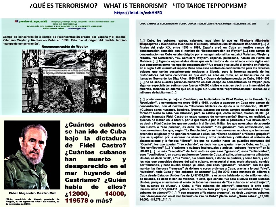 ← back to “CUBA. CAMPOS DE CONCENTRACIÓN / CUBA. CONCENTRATION CAMPS / КУБА. КОНЦЕНТРАЦИОННЫЕ ЛАГЕРЯ […] Cuba, los cubanos, saben, sabemos, muy bien lo que es #Barbarie #Barbarity #Варварство / #Genocidio #Genocide #Геноцид / #Holocausto #Holocaust #Холокост […] A finales del siglo XIX, entre 1896 y 1898, España creó en Cuba un terrible campo de concentración conocido con el nombre de “Reconcentración de Weyler” […] este campo de concentración en Cuba estaba dirigido por el sanguinario militar español Valeriano Weyler y Nicolau, “El Carnicero”, “EL Carnicero Weyler”, español, palmesano, nacido en Palma de Mallorca […] Algunos especialistas dicen que en la historia de los últimos cinco siglos eso que conocemos como “campo de concentración” fue creado y se acuñó el término en Polonia, en el siglo XVIII, cuando el Imperio Ruso creó esos centros de confinamiento para los rebeldes polacos que serían posteriormente enviados a Siberia, pero la inmensa mayoría de los historiadores del tema coinciden en que esto se creó en Cuba, en el transcurso de las llamadas Guerra de los Diez Años, 1868-1878, y Guerra de Independencia de Cuba, 1895-1898 […] no se sabe cuántas personas murieron en este campo de concentración de Weyler, pero algunos especialistas estiman que fueron 400,000 civiles o más, es decir una inmensidad de muertos, tomando en cuenta que en el siglo XIX Cuba tenía “aproximadamente” menos de 2 millones de habitantes […] posteriormente, ya bajo el #Castrismo, en la dictadura de Fidel #Castro, en la llamada “La Revolución”, y concretamente entre 1965 y 1968, vuelve a aparecer en Cuba otro campo de concentración, con el nombre de “Unidades Militares de Ayuda a la Producción, UMAP”. ¿Cuántos seres humanos, hombres, jóvenes, pasaron por estos campos castristas de trabajo forzado? Nadie lo sabe “en detalles”, pero se estima que, como mínimo, fueron 30,000. ¿A quiénes internaba Fidel Castro en estos campos de concentración? Bueno, en realidad, ¡a quiénes no metían en la UMAP!, por lo que fuera o por lo que le pareciera a “La Revolución”, es decir a Fidel Castro: los que no querían ir al Servicio Militar, los que no estaban de acuerdo con Castro o “eso parecía”, es decir “la escoria”, “los gusanos”, “los antisociales”, los homosexuales o los que, según “La Revolución”, eran homosexuales, muchos que tenían sus creencias religiosas y no querían renunciar a ellas, los “líderes sociales” o “líderes grupales” que se quejaban por la escasez de alimentos y otros productos y criticaban el sistema de abastecimiento y la famosa “libreta”, los que no querían hacer las guardias nocturnas del “Comité”, los que querían “irse echando”, es decir los que querían irse de Cuba, en fin…, a “los conflictivos” […] El campo de concentración castrista llamado UMAP no solamente creó entre los cubanos un estado de terrorismo masificado, sino que además originó un alto por ciento de desempleo y subempleo y fue la causa de varios tipos de enfermedades mentales, psicopatías y sociopatías en la población cubana, sobre todo en los hombres, pero también en los familiares de los que eran arrestados y llevados a estos campos de trabajos forzados. En ese tiempo el estrés, el miedo, el terror, la depresión, la ansiedad y el bullying se manifestaron en su máxima expresión en Cuba, exponiendo a nivel internacional otra de las tantas caras y facetas de las dictaduras militares latinoamericanas, en su versión comunista […] ¡Y cuántos y cuántos intelectuales y artistas cubanos “cayeron” en la UMAP! […] Lo más “simpático” de todo esto es que esos “gusanos”, esos “antisociales”, esos “conflictivos”, en cuanto pudieron se fueron de Cuba, al exilio, principalmente a Estados Unidos, es decir “a 90”, a “La Yuma”, o a donde fuera, a donde se pudiera, y como fuera, y con los más que conocidos riesgos del exilio cubano, en especial el mar, morir ahogado, comido por tiburones, y hace mucho tiempo ya, años, que esos “gusanos”, “escoria”, son los que mandan las famosas “remesas” de dólares o euros o divisas a Cuba, gracias a lo cual “vive”, “subsiste”, toda Cuba y “los cubanos de adentro” […] En 2013 estas remesas de dólares a Cuba desde Estados Unidos fue de 2,497,031,206 , y estamos hablando no de millones, sino de billones, es decir millón de millones. Y esto, que conste, fue sólo el envío desde Estados Unidos, porque si sumamos el envío de todas las remesas de “los cubanos en el extranjero”, “los cubanos de afuera”, a Cuba, a “los cubanos de adentro”, entonces la cifra sería inmensísima: 2,777,363,411. ¿Ahora se entiende bien por qué y cómo subsisten Cuba y “los cubanos de adentro”? […] Y con respecto a “la eterna pregunta”, es decir ¿cuántos cubanos han “desaparecido” en el mar tratando de irse de Cuba? ¡Nadie sabe! ¿Quién sabe?: ¿12,000; 14,000; 119,578…? […]”