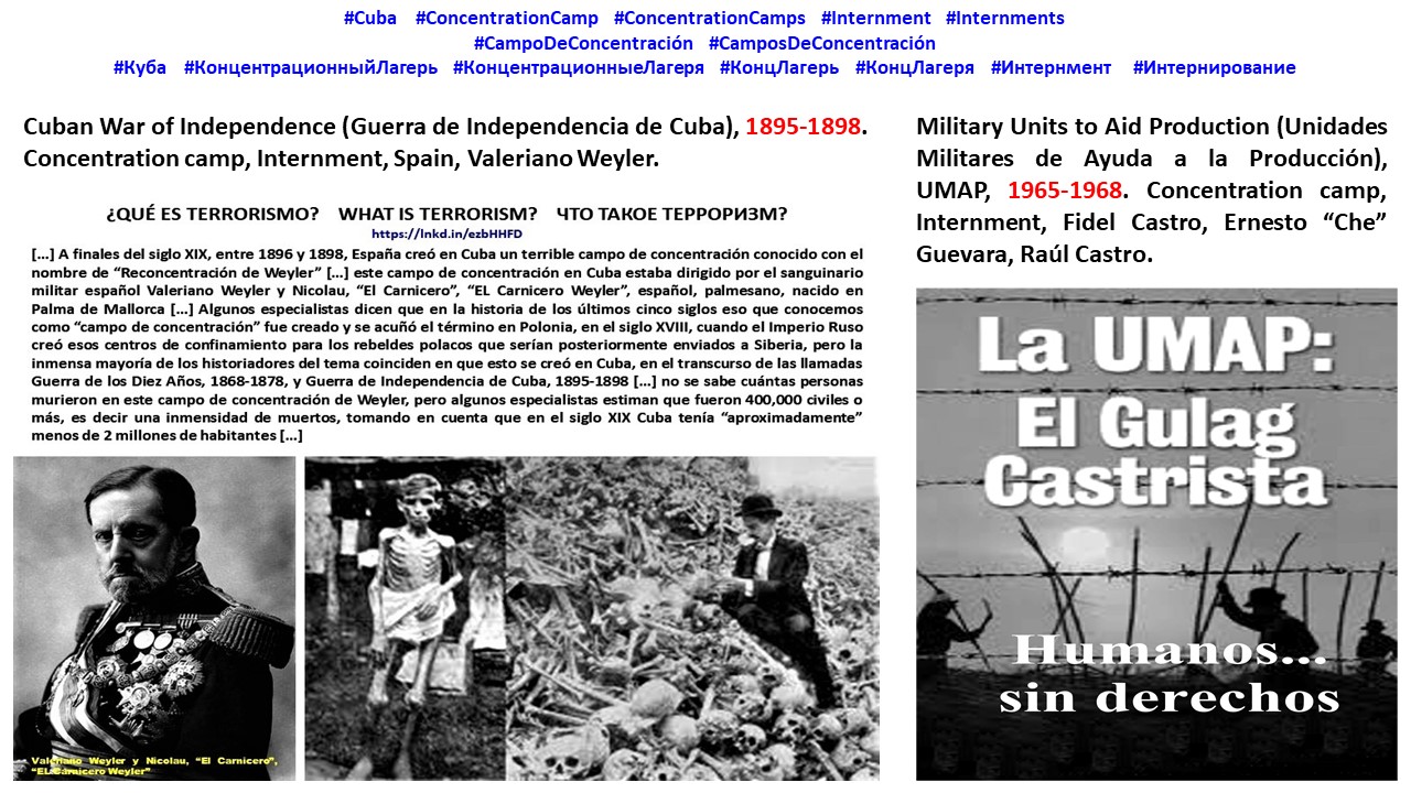 ← back to “CUBA. CAMPOS DE CONCENTRACIÓN / CUBA. CONCENTRATION CAMPS / КУБА. КОНЦЕНТРАЦИОННЫЕ ЛАГЕРЯ […] Cuba, los cubanos, saben, sabemos, muy bien lo que es #Barbarie #Barbarity #Варварство / #Genocidio #Genocide #Геноцид / #Holocausto #Holocaust #Холокост […] A finales del siglo XIX, entre 1896 y 1898, España creó en Cuba un terrible campo de concentración conocido con el nombre de “Reconcentración de Weyler” […] este campo de concentración en Cuba estaba dirigido por el sanguinario militar español Valeriano Weyler y Nicolau, “El Carnicero”, “EL Carnicero Weyler”, español, palmesano, nacido en Palma de Mallorca […] Algunos especialistas dicen que en la historia de los últimos cinco siglos eso que conocemos como “campo de concentración” fue creado y se acuñó el término en Polonia, en el siglo XVIII, cuando el Imperio Ruso creó esos centros de confinamiento para los rebeldes polacos que serían posteriormente enviados a Siberia, pero la inmensa mayoría de los historiadores del tema coinciden en que esto se creó en Cuba, en el transcurso de las llamadas Guerra de los Diez Años, 1868-1878, y Guerra de Independencia de Cuba, 1895-1898 […] no se sabe cuántas personas murieron en este campo de concentración de Weyler, pero algunos especialistas estiman que fueron 400,000 civiles o más, es decir una inmensidad de muertos, tomando en cuenta que en el siglo XIX Cuba tenía “aproximadamente” menos de 2 millones de habitantes […] posteriormente, ya bajo el #Castrismo, en la dictadura de Fidel #Castro, en la llamada “La Revolución”, y concretamente entre 1965 y 1968, vuelve a aparecer en Cuba otro campo de concentración, con el nombre de “Unidades Militares de Ayuda a la Producción, UMAP”. ¿Cuántos seres humanos, hombres, jóvenes, pasaron por estos campos castristas de trabajo forzado? Nadie lo sabe “en detalles”, pero se estima que, como mínimo, fueron 30,000. ¿A quiénes internaba Fidel Castro en estos campos de concentración? Bueno, en realidad, ¡a quiénes no metían en la UMAP!, por lo que fuera o por lo que le pareciera a “La Revolución”, es decir a Fidel Castro: los que no querían ir al Servicio Militar, los que no estaban de acuerdo con Castro o “eso parecía”, es decir “la escoria”, “los gusanos”, “los antisociales”, los homosexuales o los que, según “La Revolución”, eran homosexuales, muchos que tenían sus creencias religiosas y no querían renunciar a ellas, los “líderes sociales” o “líderes grupales” que se quejaban por la escasez de alimentos y otros productos y criticaban el sistema de abastecimiento y la famosa “libreta”, los que no querían hacer las guardias nocturnas del “Comité”, los que querían “irse echando”, es decir los que querían irse de Cuba, en fin…, a “los conflictivos” […] El campo de concentración castrista llamado UMAP no solamente creó entre los cubanos un estado de terrorismo masificado, sino que además originó un alto por ciento de desempleo y subempleo y fue la causa de varios tipos de enfermedades mentales, psicopatías y sociopatías en la población cubana, sobre todo en los hombres, pero también en los familiares de los que eran arrestados y llevados a estos campos de trabajos forzados. En ese tiempo el estrés, el miedo, el terror, la depresión, la ansiedad y el bullying se manifestaron en su máxima expresión en Cuba, exponiendo a nivel internacional otra de las tantas caras y facetas de las dictaduras militares latinoamericanas, en su versión comunista […] ¡Y cuántos y cuántos intelectuales y artistas cubanos “cayeron” en la UMAP! […] Lo más “simpático” de todo esto es que esos “gusanos”, esos “antisociales”, esos “conflictivos”, en cuanto pudieron se fueron de Cuba, al exilio, principalmente a Estados Unidos, es decir “a 90”, a “La Yuma”, o a donde fuera, a donde se pudiera, y como fuera, y con los más que conocidos riesgos del exilio cubano, en especial el mar, morir ahogado, comido por tiburones, y hace mucho tiempo ya, años, que esos “gusanos”, “escoria”, son los que mandan las famosas “remesas” de dólares o euros o divisas a Cuba, gracias a lo cual “vive”, “subsiste”, toda Cuba y “los cubanos de adentro” […] En 2013 estas remesas de dólares a Cuba desde Estados Unidos fue de 2,497,031,206 , y estamos hablando no de millones, sino de billones, es decir millón de millones. Y esto, que conste, fue sólo el envío desde Estados Unidos, porque si sumamos el envío de todas las remesas de “los cubanos en el extranjero”, “los cubanos de afuera”, a Cuba, a “los cubanos de adentro”, entonces la cifra sería inmensísima: 2,777,363,411. ¿Ahora se entiende bien por qué y cómo subsisten Cuba y “los cubanos de adentro”? […] Y con respecto a “la eterna pregunta”, es decir ¿cuántos cubanos han “desaparecido” en el mar tratando de irse de Cuba? ¡Nadie sabe! ¿Quién sabe?: ¿12,000; 14,000; 119,578…? […]”