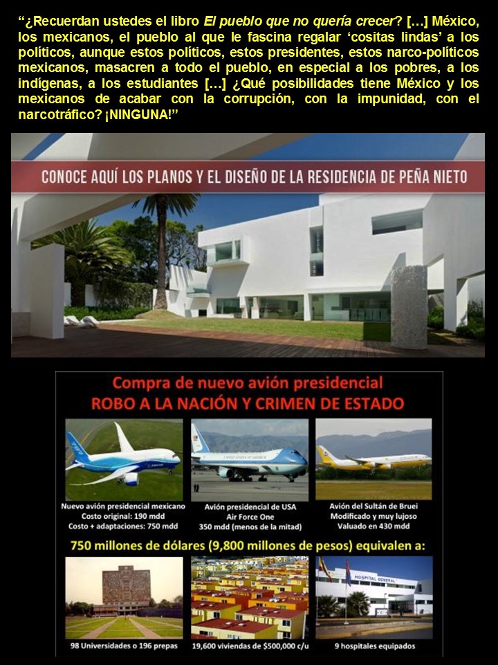 […] Libros como estos, excelentes libros por cierto, se quedaron cortos a la hora de reflejar la verdadera realidad de México y los mexicanos […] ¿Cada año entre 18,000 y 20,000 muertos en México a causa del narcotráfico, a causa de la guerra de las drogas, a causa de las guerras de las drogas? ¿Cada año 500 niños muertos a causa de las guerras en México? […] Cuando hablamos en nuestra conferencia “Ceguera Social en Plena Globalización” […] ahí hicimos muchas referencias a los “países-morgues”, “países-fosas comunes”, “países-funerarias”, “países-cementerios”, “países-narcofosas”, “países-holocaustos”, “países-barbaries”, “países-masacres”, “países-genocidios”, “países-infiernos”, “países-basuras” […] ¿Se puede decir la verdad en México? No, porque, por un lado, en México “no se puede decir la verdad”, y, por otro lado, a los mexicanos no les enseñan a decir la verdad […] ¿No recuerdan el libro Mito y magia del mexicano, de Jorge Carrión? […] los mexicanos, como una buena parte de esta América medio analfabeta, han vivido toda su vida entre los mitos, los mitoides, la micromanía y las cantinfladas […] Cantinflear, cantinfleo, cantinflada, es algo que he definido como el ESTADO DEL PAPALOTEO MENTAL, PAPALOTEAR MENTALMENTE […] En el lenguaje verbal y en el lenguaje corporal de los mexicanos, en general y en cualquier contexto, tal pareciera que por encima de la precisión siempre imperará la imprecisión: nunca un “el”, nunca un “la”, nunca un “los”, nunca un “ese”, nunca un “esa”, nunca un “esos”, y siempre un “un”, un “una”, un “unos”… Como decía Antaki (1996): siempre lo general y confuso: “flor y fruta”, nunca lo particular y claro: “jacaranda y ciruela”. ¿Y por qué siempre “lo general”? Muy sencillo, porque a los mexicanos no les enseñan “lo particular”. Les enseñan a dar rodeos para todo, y lo directo se ve como feo, como grosero, como no mexicano, aunque todos sabemos lo que hay verdaderamente detrás de todo esto: “las máscaras mexicanas que tanto daño le han hecho a México y a los mexicanos, y también, de paso, a los países extranjeros y a los extranjeros”: mentir y mentir y mentir […] ¿No recuerdan el libro El laberinto de la soledad, de Octavio Paz? […] ¿No recuerdan el libro El gesticulador, de Rodolfo Usigli? […] ¿No recuerdan el libro El pueblo que no quería crecer, de Ikram Antaki? […]