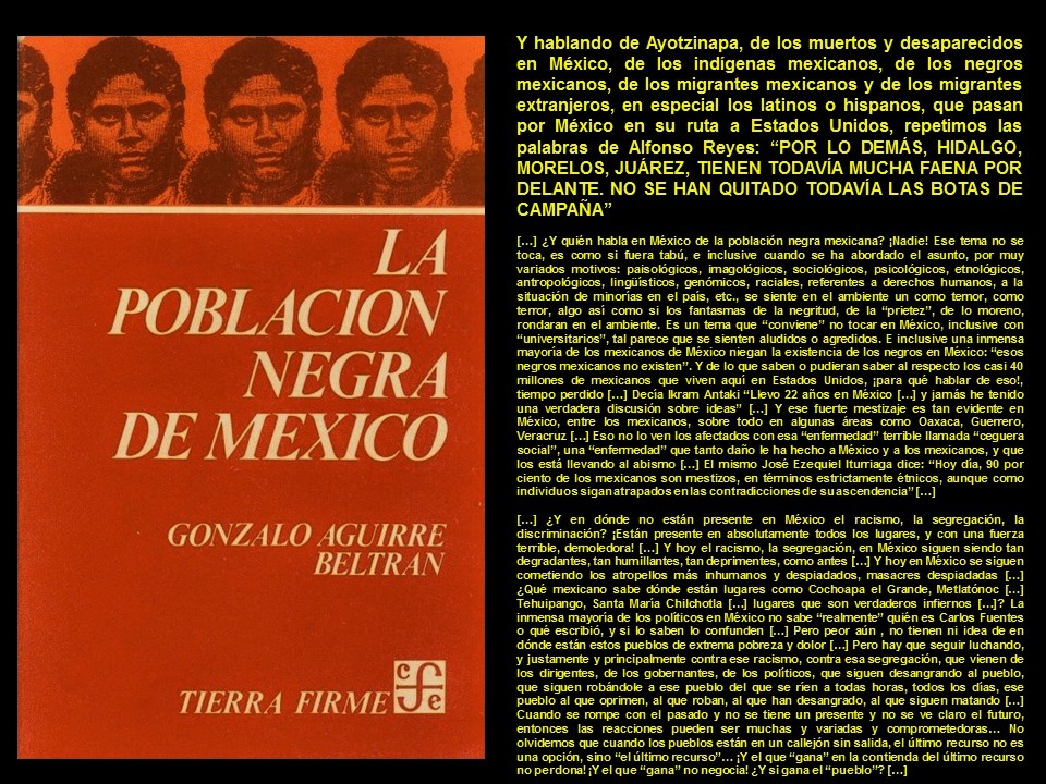 […] ¿Y quién habla en México de la población negra mexicana? ¡Nadie! Ese tema no se toca, es como si fuera tabú, e inclusive cuando se ha abordado el asunto, por muy variados motivos: paisológicos, imagológicos, sociológicos, psicológicos, etnológicos, antropológicos, lingüísticos, genómicos, raciales, referentes a derechos humanos, a la situación de minorías en el país, etc., se siente en el ambiente un como temor, como terror, algo así como si los fantasmas de la negritud, de la “prietez”, de lo moreno, rondaran en el ambiente. Es un tema que “conviene” no tocar en México, inclusive con “universitarios”, tal parece que se sienten aludidos o agredidos. E inclusive una inmensa mayoría de los mexicanos de México niegan la existencia de los negros en México: “esos negros mexicanos no existen”. Y de lo que saben o pudieran saber al respecto los casi 40 millones de mexicanos que viven aquí en Estados Unidos, ¡para qué hablar de eso!, tiempo perdido […] Decía Ikram Antaki “Llevo 22 años en México […] y jamás he tenido una verdadera discusión sobre ideas” A propósito del excelente libro EL PUEBLO QUE NO QUERÍA CRECER, de Ikram Antaki […] Y ese fuerte mestizaje es tan evidente en México, entre los mexicanos, sobre todo en algunas áreas como Oaxaca, Guerrero, Veracruz […] Eso no lo ven los afectados con esa “enfermedad” terrible llamada “ceguera social”, una “enfermedad” que tanto daño le ha hecho a México y a los mexicanos, y que los está llevando al abismo […] El mismo José Ezequiel Iturriaga dice: “Hoy día, 90 por ciento de los mexicanos son mestizos, en términos estrictamente étnicos, aunque como individuos sigan atrapados en las contradicciones de su ascendencia” RACISMO EN MÉXICO […] ¿Y en dónde no están presente en México el racismo, la segregación, la discriminación? ¡Están presente en absolutamente todos los lugares, y con una fuerza terrible, demoledora! […] Y hoy el racismo, la segregación, en México siguen siendo tan degradantes, tan humillantes, tan deprimentes, como antes […] Y hoy en México se siguen cometiendo los atropellos más inhumanos y despiadados, masacres despiadadas […] ¿Qué mexicano sabe dónde están lugares como Cochoapa el Grande, Metlatónoc […] Tehuipango, Santa María Chilchotla […] lugares que son verdaderos infiernos […]? ¿¡Qué México ha cambiado!?, ¿en qué? […] MÉXICO: ¿Qué mexicano conoce “de verdad” lo que pasa en Cochoapa el Grande? Para llorar a los muertos primero hay que encontrarlos; y si no encontramos sus cuerpos, entonces siempre estarán vivos. Y debates van y vienen, y entrevistas van y vienen, y discursos van y vienen, “puro show”, “puras cantinfladas”. ¿Y quién habla de los más pobres de México: COCHOAPA EL GRANDE, METLATÓNOC, ACATEPEC, TEHUIPANGO, SANTA MARÍA CHILCHOTLA…? Busquen, por ejemplo, en TWITTER el nombre de Cochoapa el Grande, nadie habla de él, no existe, no lo menciona nadie, pueblos fantasmas. ¡Pobre de aquél que nazca en uno de estos pueblos en México!, no solamente será un pobre, sino que será olvidado, borrado, para siempre, así funciona México. […] MÉXICO: MASACRES EN ACTEAL, CHERÁN, COPALA, COCHOAPA EL GRANDE, METLATÓNOC, ACATEPEC, TEHUIPANGO, SANTA MARÍA CHILCHOTLA… PARA LLORAR A LOS MUERTOS PRIMERO HAY QUE ENCONTRARLOS; Y SI NO ENCONTRAMOS SUS CUERPOS, ENTONCES SIEMPRE ESTARÁN VIVOS. ¡TODO MÉXICO HA SIDO Y ES UN HOLOCAUSTO, UN GENOCIDIO! ¡HASTA CUÁNDO! […] EL ETERNO ROBADERO DE LOS POLÍTICOS MEXICANOS: ¿Y QUÉ HACEN LOS GOBIERNOS Y LOS POLÍTICOS DE MÉXICO MIENTRAS EN LUGARES COMO COCHOAPA EL GRANDE, METLATÓNOC, ACATEPEC, TEHUIPANGO, SANTA MARÍA CHILCHOTLA Y OTROS MUCHOS MÁS LA GENTE, LITERALMENTE HABLANDO, MUERE DE HAMBRE, DESNUTRICIÓN Y NECESIDADES? […]