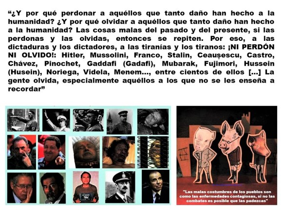 “¿Y por qué perdonar a aquéllos que tanto daño han hecho a la humanidad? ¿Y por qué olvidar a aquéllos que tanto daño han hecho a la humanidad? Las cosas malas del pasado y del presente, si las perdonas y las olvidas, entonces se repiten. Por eso, a las dictaduras y los dictadores, a las tiranías y los tiranos: ¡NI PERDÓN NI OLVIDO!: Hitler, Mussolini, Franco, Stalin, Ceaușescu, Castro, Chávez, Pinochet, Gaddafi (Gadafi), Mubarak, Fujimori, Hussein (Husein), Noriega, Videla, Menem…, entre cientos de ellos […] La gente olvida, especialmente aquéllos a los que no se les enseña a recordar”