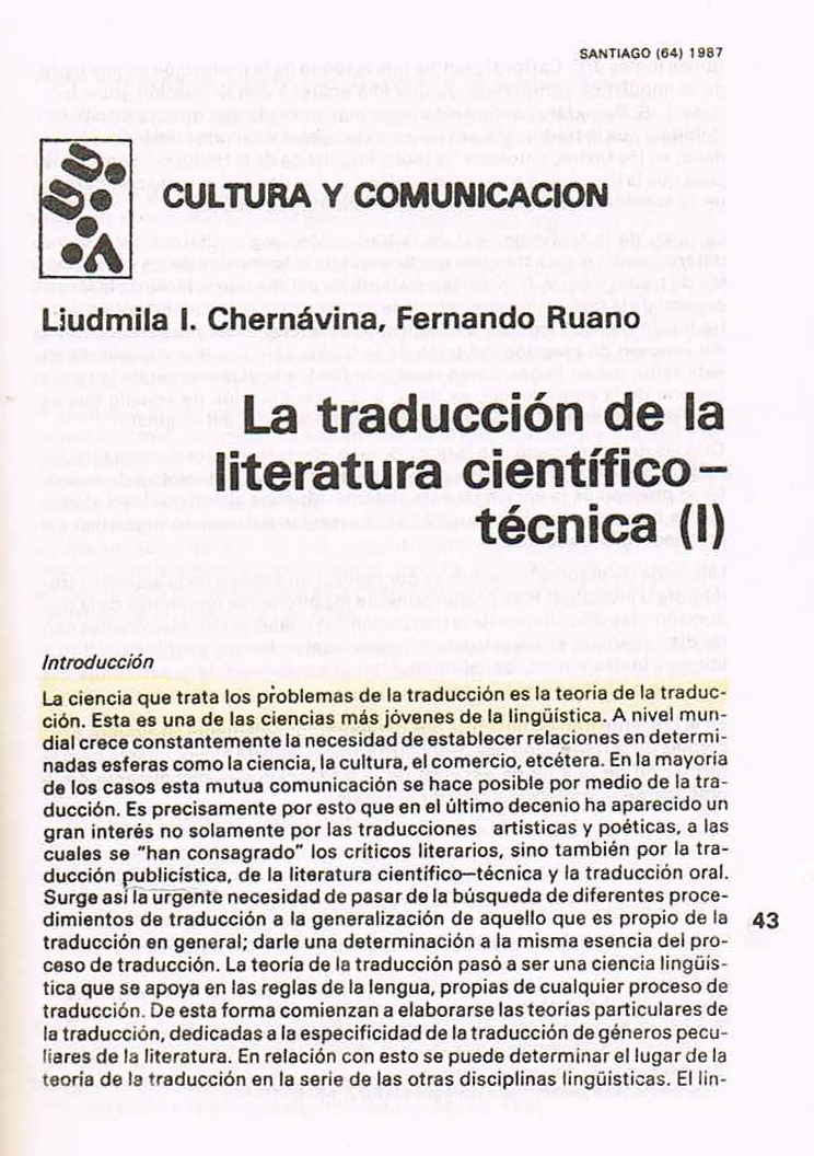 1987. “La traducción de la literatura científica y técnica I”. En Santiago, revista de la Universidad de Oriente, Ministerio de Educación Superior de Cuba, 64:43-72.
