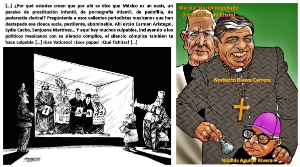 […] ¿Por qué ustedes creen que por ahí se dice que México es un oasis, un paraíso de prostitución infantil, de pornografía infantil, de pedofilia, de pederastia clerical? Pregúntenle a esos valientes periodistas mexicanos que han destapado esa cloaca sucia, pestilente, abominable. Ahí están Carmen Aristegui, Lydia Cacho, Sanjuana Martínez… Y aquí hay muchos culpables, incluyendo a los políticos mexicanos con su silencio cómplice, el silencio cómplice también te hace culpable […] ¡Ese Vaticano! ¡Esos papas! ¡Qué fichitas! […]