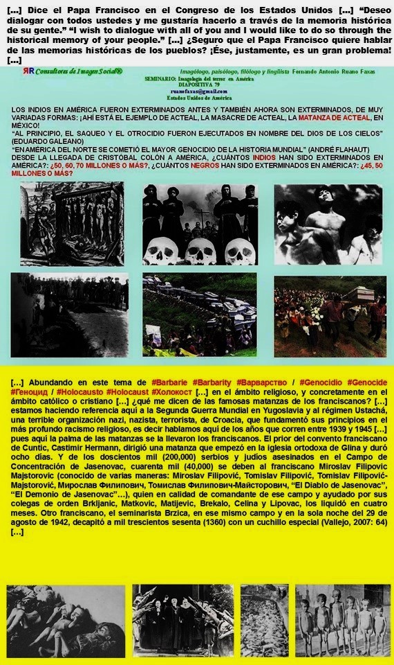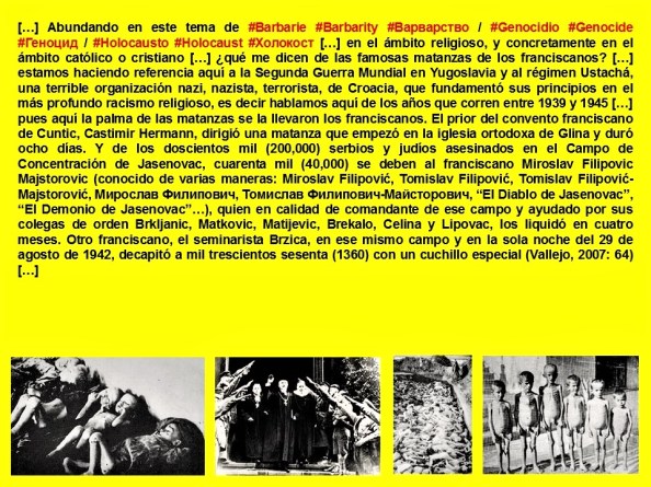 […] Abundando en este tema de #Barbarie #Barbarity #Варварство / #Genocidio #Genocide #Геноцид / #Holocausto #Holocaust #Холокост […] en el ámbito religioso, y concretamente en el ámbito católico o cristiano […] ¿qué me dicen de las famosas matanzas de los franciscanos? […] estamos haciendo referencia aquí a la Segunda Guerra Mundial en Yugoslavia y al régimen Ustachá, una terrible organización nazi, nazista, terrorista, de Croacia, que fundamentó sus principios en el más profundo racismo religioso, es decir hablamos aquí de los años que corren entre 1939 y 1945 […] pues aquí la palma de las matanzas se la llevaron los franciscanos. El prior del convento franciscano de Cuntic, Castimir Hermann, dirigió una matanza que empezó en la iglesia ortodoxa de Glina y duró ocho días. Y de los doscientos mil (200,000) serbios y judíos asesinados en el Campo de Concentración de Jasenovac, cuarenta mil (40,000) se deben al franciscano Miroslav Filipovic Majstorovic (conocido de varias maneras: Miroslav Filipović, Tomislav Filipović, Tomislav Filipović-Majstorović, Мирослав Филипович, Томислав Филипович-Майсторович, “El Diablo de Jasenovac”, “El Demonio de Jasenovac”…), quien en calidad de comandante de ese campo y ayudado por sus colegas de orden Brkljanic, Matkovic, Matijevic, Brekalo, Celina y Lipovac, los liquidó en cuatro meses. Otro franciscano, el seminarista Brzica, en ese mismo campo y en la sola noche del 29 de agosto de 1942, decapitó a mil trescientos sesenta (1360) con un cuchillo especial (Vallejo, 2007: 64) […]