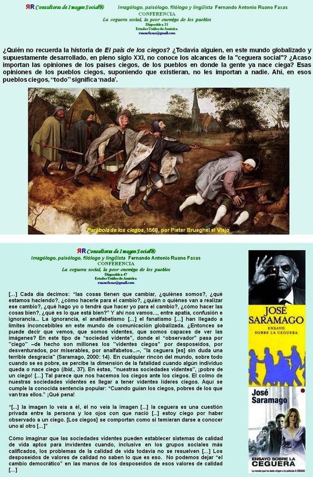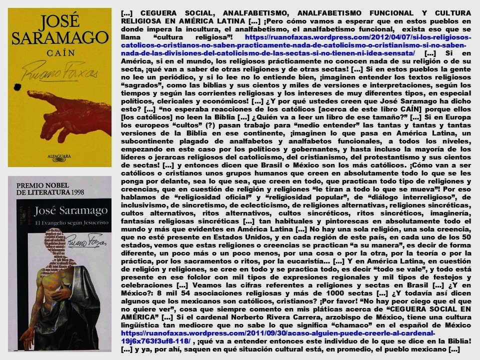 […] Antes, en el tiempo de las cavernas, había cosas, conceptos, trascendentales para los cavernícolas, como alimento, comida, hambre, cavernas o lugares para protegerse de las inclemencias del tiempo, tener armas para defenderse de todo lo que fuera o pareciera un peligro, para defenderse de otros grupos humanos, inclusive aquellos emparentados con ellos mismos, lo que hoy llamamos “pueblos hermanos”, armas para matar a otros animales que finalmente serían parte de su dieta […] creer en “algo” que traería buena o mala suerte, lo que hoy se llama dios, virgen, espíritu, brujo, bruja […] creer en “líderes religiosos”, algo así como un Vaticano de aquellos tiempos. También entre los cavernícolas era necesario “educar” a niños y jóvenes en todo aquello que para ellos era cuestión de vida o muerte, es decir, sobre todo en las artes de la cacería y las batallas, la defensa […] hoy, en estos tiempos llamados “civilización”, seguimos igual, necesitamos comida y casa, los ricos tienen buenas comidas y casas y los pobres tienen malas comidas y casas, o de plano no tienen; estamos armados hasta los dientes, para atacar a lo que sea, en el momento que sea, aunque no solamente no sea necesario, sino peor, criminal; los fuertes atacan a los débiles, y los débiles viven intentando destruirse entre ellos mismos, por eso les hablo de “endofagia” y “endocanibalismo” en América Latina, entre otros lugares […] Las grandes potencias “atacan” por muchos medios a los países tercermundistas, y los países tercermundistas “se entretienen” en pelear entre ellos y, peor aún, en autodestruirse, es decir cuando dentro de un mismo país, dentro de un mismo pueblo, viven matándose entre ellos, como ha sucedido y sigue sucediendo en la mayoría de los países de América Latina, y sobre todo en México, Colombia, Honduras, El Salvador, Guatemala, Venezuela… […] Respecto de la educación, los ricos tienen las mejores, y los pobres o tienen las malas o de plano no tienen ninguna, y hablo aquí de millones, no solamente de unos pocos. Se habla de que hoy hay en el mundo entre 120 y 200 millones de niños sin educación. La cifra “más o menos exacta” de niños en la calle ya nadie la tiene, ¡son tantos! […] ¿Memoria en América Latina? ¡Por favor! ¿Memoria histórica entre los latinos, entre los hispanos, entre los latinoamericanos? ¡Por favor! […] Como dice José Saramago “Somos la memoria que tenemos y la responsabilidad que asumimos, sin memoria no existimos y sin responsabilidad quizá no merezcamos existir” […] “Es hora de aullar, porque si nos dejamos llevar por los poderes que nos gobiernan, y no hacemos nada por contrarrestarlos, se puede decir que nos merecemos lo que tenemos” […] ¿Cuándo los latinoamericanos entenderemos que ni han existido ni existen ni existirán los milagros? América Latina sólo tiene una vía para resolver sus grandes, terribles y añejos problemas: las elecciones, el voto, y elegir a los buenos, no a la mierda […] recuerden lo que les he comentado tantas veces en TWITTER: #Elecciones #Abstencionismo #Abstención #Valemadrismo #Importamadrismo #Indiferencia #Apatía #Desidia #Negligencia #Indolencia #Procrastinación #Ignorancia #Fanatismo #Analfabetismo #AnalfabetismoFuncional https://twitter.com/search?f=tweets&vertical=default&q=VALEMADRISMO%20ruanofaxas&src=typd […] “¿Por eso estamos como estamos?” “¿Todo pueblo tiene el gobierno que se merece?” […]