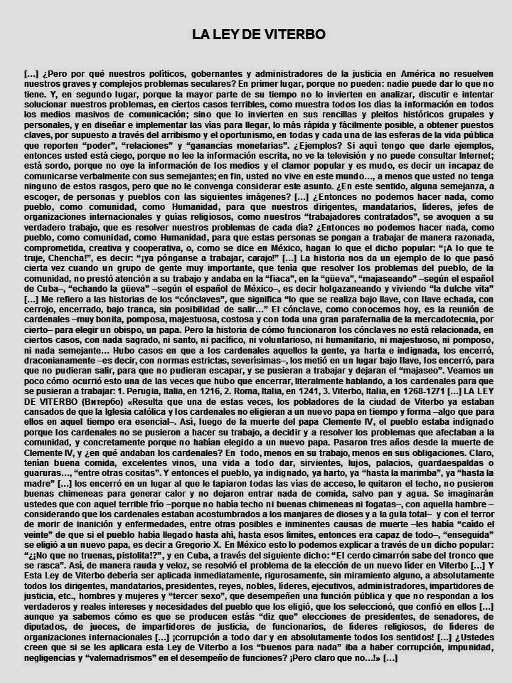 […] TERRORISMO RELIGIOSO […] El sólo mencionar a las RELIGIONES ABRAHÁMICAS, es decir JUDAÍSMO, CRISTIANISMO e ISLAM, en automático nos hace pensar en toda una historia terrible de persecuciones, de violaciones de todo tipo, de muertos, de sangre, de torturas, de masacres, de genocidios, de ejecuciones. Sólo los ignorantes, los que no conocen nada de historia, podrían negar esto […] ¿Con qué cosa, mala o buena, generalmente mala, no están relacionadas las grandes y reconocidas religiones del mundo? ¿Tengo que hablar aquí del “terrorismo religioso” en sus tantas y tan variadas formas y estilos? Terrorismo religioso es tanto el matar a los demás por ideas religiosas como la pederastia, la pedofilia, practicada por los líderes religiosos y sus semejantes, incluyendo a sus cómplices. ¿Ya olvidaron la Inquisición? ¿Tengo que hablar aquí acerca de ese cáncer social llamado “pederastia clerical”? […]