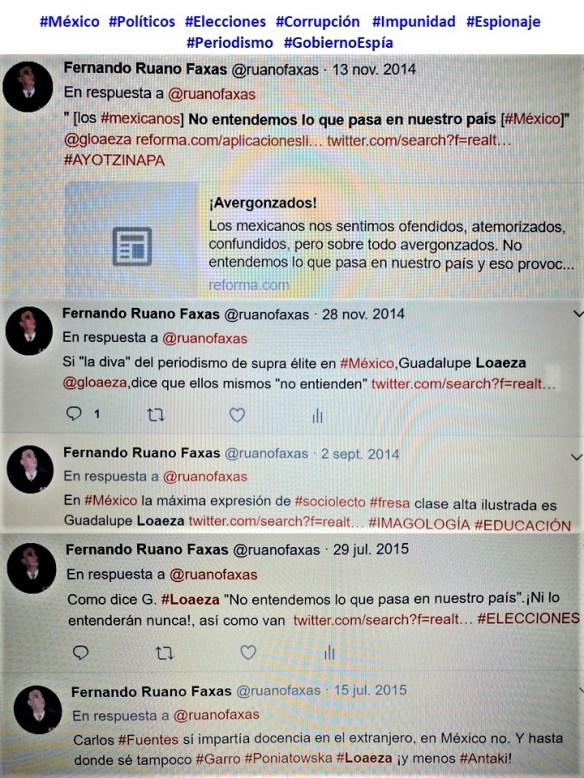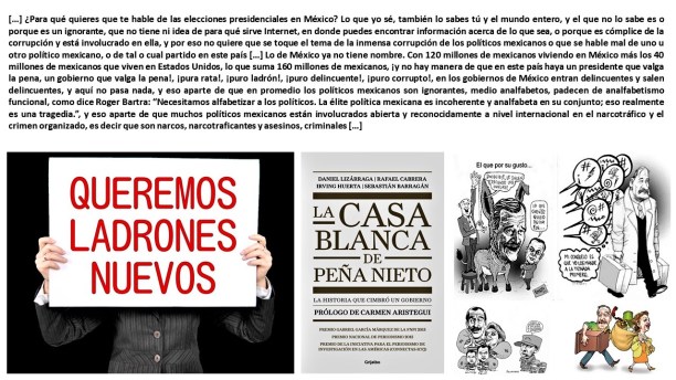 […] ¿Para qué quieres que te hable de las elecciones presidenciales en México? Lo que yo sé, también lo sabes tú y el mundo entero, y el que no lo sabe es o porque es un ignorante, que no tiene ni idea de para qué sirve Internet, en donde puedes encontrar información acerca de lo que sea, o porque es cómplice de la corrupción y está involucrado en ella, y por eso no quiere que se toque el tema de la inmensa corrupción de los políticos mexicanos o que se hable mal de uno u otro político mexicano, o de tal o cual partido en este país […] Lo de México ya no tiene nombre. Con 120 millones de mexicanos viviendo en México más los 40 millones de mexicanos que viven en Estados Unidos, lo que suma 160 millones de mexicanos, ¡y no hay manera de que en este país haya un presidente que valga la pena, un gobierno que valga la pena!, ¡pura rata!, ¡puro ladrón!, ¡puro delincuente!, ¡puro corrupto!, en los gobiernos de México entran delincuentes y salen delincuentes, y aquí no pasa nada, y eso aparte de que en promedio los políticos mexicanos son ignorantes, medio analfabetos, padecen de analfabetismo funcional, como dice Roger Bartra: “Necesitamos alfabetizar a los políticos. La élite política mexicana es incoherente y analfabeta en su conjunto; eso realmente es una tragedia.”, y eso aparte de que muchos políticos mexicanos están involucrados abierta y reconocidamente a nivel internacional en el narcotráfico y el crimen organizado, es decir que son narcos, narcotraficantes y asesinos, criminales […]