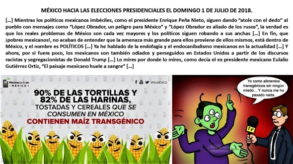 […] Mientras los políticos mexicanos imbéciles, como el presidente Enrique Peña Nieto, siguen dando “atole con el dedo” al pueblo con mensajes como “López Obrador, un peligro para México” y “López Obrador es aliado de los rusos”, la verdad es que los reales problemas de México son cada vez mayores y los políticos siguen robando a sus anchas […] En fin, que ¡pobres mexicanos!, no acaban de entender que la amenaza más grande para ellos proviene de ellos mismos, está dentro de México, y el nombre es POLÍTICOS […] Ya he hablado de la endofagia y el endocanibalismo mexicanos en la actualidad […] Y ahora, por si fuera poco, los mexicanos son también odiados y perseguidos en Estados Unidos a partir de los discursos racistas y segregacionistas de Donald Trump […] Lo mires por donde lo mires, como decía el ex presidente mexicano Eulalio Gutiérrez Ortiz, “El paisaje mexicano huele a sangre” […]