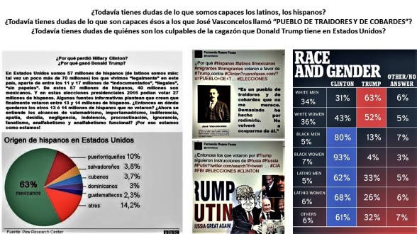 […] “Marco Gutiérrez es un estadounidense descendiente de mexicanos, pero no sólo eso, es el fundador de MEXICANOS CON TRUMP. A pesar de sus rasgos notablemente latinos, irónicamente, reniega de sus paisanos y es uno de los principales promotores que difunden la ideología de la NO MIGRACIÓN EN ESTADOS UNIDOS.” ¡Ay, estos hispanos, estos latinos, estos mexicanos, ni cómo ayudarlos! A esta gente nunca les “caerá el veinte” […] Y aquí les recuerdo el origen de esta frase “caer el veinte”, hace muchos años en México las cabinas de teléfono funcionaban con monedas de veinte centavos. Si la moneda entraba bien, si caía, entonces se establecía la comunicación; de lo contrario, la comunicación no se producía […] Imagínense nada más a latinos, a hispanos, sabiendo lo que iba a pasar a 11, 13 ó 17 millones de nuestros hermanos migrantes “indocumentados”, “ilegales”, “sin papeles”, ¡y votando por Donald Trump! Por eso el famoso pensador mexicano José Vasconcelos los llamó “traidores” […] Por eso Manuel Salvador Ruiz “Salvo Ruiz” decía: “UN NEGRO [INDIO, PRIETO, MORENO, MULATO…] CONSERVADOR ES MÚSICA QUE NO SUENA, ES UN PARCHE EN UNA NALGA CUANDO EL DOLOR ES DE MUELA” […]