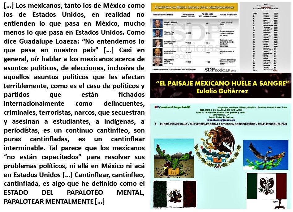 ← back to “[…] Los mexicanos no tienen “ni puta idea” de lo que es VERDAD, en absolutamente todos los sentidos […] La MENTIRA en México, como en toda América Latina, antes y ahora, es el pan nuestro de cada día […] Los mexicanos, como una muy buena parte de los latinoamericanos, la inmensa mayoría, no necesitan hablar, mover la boca y emitir sonidos, para decir mentiras; con sus gestos, con su lenguaje corporal, las dicen, y “no se miden”. “¡Qué capacidad!”, “¡ay, güey!”, “¡ay, chingao!”, ¡ese eterno cantinflear! […] ¿Para qué sirve Internet a los latinoamericanos, a los iberoamericanos, a los latinos, a los hispanos, si la mayoría de ellos no sabe leer bien (¡si es que saben leer!), si no buscan noticias, si en promedio lo que les encanta es Facebook para estar en el “chacoteo”, es decir en caerse a mentiras en un “todos contra todos”? […] Como dice Ikram Antaki: “En México […] mentimos porque no hay razón alguna para decir la verdad” […] Como dice Octavio Paz: “Nuestra vida diaria sería inexplicable sin la mentira […] La mentira inunda la vida mexicana […] Algunos historiadores recientes proclaman que nuestra historia es un tejido de mentiras […] mienten nuestros reaccionarios tanto como nuestros revolucionarios […] nuestra vida diaria sería inexplicable sin la mentira que la alimenta […] La mentira inunda la vida mexicana: ficción es nuestra política electoral” […] Como dice Sara Sefchovich: “País de mentiras” […] México es un país que no conoce la verdad […] Como dice Martín Moreno: “México engañado […] Justicia, es una palabra que los mexicanos han olvidado […] ¿Quién va a creer que Aburto fue un asesino solitario de Colosio, cuando éste tenía un orificio de bala en la cabeza y otro en el estómago y, además, de diferente calibre…? […] ¿A quién le creen los mexicanos? ¿Al sacerdote, al maestro, al político, al comentarista de radio y televisión? ¿A quién? ¿A Marta Sahagún? ¿A la Gordillo? ¿Al cardenal…? Lo verdaderamente grave de todo esto es que los mexicanos ya no creemos en nada ni en nadie. La mula no era arisca… Estamos sepultados en el pozo del escepticismo” […] Y no hablemos ya de “las historias” (¿o cuentos?) de las elecciones en México […] ¡Esas historias de LA CASA BLANCA DE ENRIQUE PEÑA NIETO “EL COPETES” “JIMMY NEUTRÓN” “EL GAVIOTO” Y “LA GAVIOTA” ANGÉLICA RIVERA, “¡ta’ cabrón!” […] ¿¡Los muertos y desaparecidos en México!? “¡Ésa es otra historia!” […]”