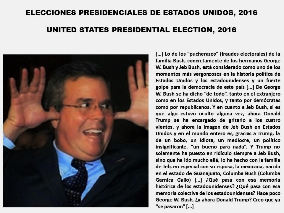 ← back to “[…] ELECCIONES PRESIDENCIALES EN ESTADOS UNIDOS. HACE POCO GEORGE W. BUSH, ¿¡Y AHORA DONALD TRUMP!? ¿Y DÓNDE QUEDÓ LA MEMORIA HISTÓRICA DE LOS ESTADOUNIDENSES? ¿Y DÓNDE QUEDÓ LA MEMORIA COLECTIVA DE LOS ESTADOUNIDENSES? ¿Y DÓNDE QUEDÓ LA CONSCIENCIA COLECTIVA DE LOS ESTADOUNIDENSES? ¿Y DONDE QUEDÓ LA INTELIGENCIA COLECTIVA DE LOS ESTADOUNIDENSES? […] ¿Recuerdan ustedes lo que dijo el escritor y guionista estadounidense Howard Fast, que fue el que escribió la novela Spartacus (Espartaco), en la que se fundamentó la película Spartacus (Espartaco), de Stanley Kubrick, protagonizada por Kirk Douglas?: “Americans have no sense of history. And not much memory. They don’t remember what happened yesterday.” “Los estadounidenses no tienen sentido de la historia. Y no tienen mucha memoria. No recuerdan lo que pasó ayer.” […] Ésta sigue siendo, y será, “la pregunta de los 64 mil…” […] ¿Cómo es posible que hoy, habiendo Internet hasta en las selvas y en el medio de los océanos, que todo el mundo puede enterarse de todo, en todos los idiomas de este mundo, en los 5 continentes, un individuo como Donald Trump pueda llegar a ser un candidato a la presidencia en uno de los dos países más poderosos del planeta: Estados Unidos de América (el otro país más poderoso del mundo, como todos sabemos, es Rusia) […] Entiendo que estas “cosas raras” pasen en nuestros países latinoamericanos atrasados, tercermundistas, en donde hasta el aire que se respira está intoxicado de corrupción, en donde un voto vale 8 dólares o menos, en donde se le da una bolsita con arroz, frijoles y aceite a cualquiera en la calle, o se le da una tortica con huevo y frijol y un refresco de Coca-Cola, y ya, eso es lo que vale un voto, entiendo que estas “cosas raras” pasen en nuestros países iberoamericanos, con un historial avergonzante de dictaduras partidistas, dictaduras militares y golpes de estado, ¿¡pero que la corrupción electoral, que el fraude electoral, esté a la orden del día en la potencia más grande del mundo, que decide en parte, junto a Rusia, la suerte de este planeta!? Como se dice por allá: “¡Ay, güey…!” […] Hace rato ya que el Partido Republicano de Estados Unidos, GOP, viene en una decadencia imparable. Y ahora, por lo visto, ya llegó al límite. ¿O es que todavía veremos mucho más? Lo de la llegada de George W. Bush a la presidencia, el hombre que casi destruye a Estados Unidos y que abrió la Caja de Pandora del terrorismo debido a su ataque o invasión a Irak (o Iraq), en busca de unas armas de destrucción masiva que, en realidad, nunca existieron, lo entendemos: en aquellos tiempos en que George W. Bush fue electo presidente no había Internet masificada, muchas cosas no se sabían, y si se sabían no tenían difusión masificada, aparte de las más que conocidas “controversias electorales” en su contra (en contra de Bush) en las elecciones relacionadas con su primer mandato, 2001-2005, cuando su contrincante demócrata fue Al Gore, y aquí el escándalo más grande que afecta a George W. Bush en ese momento, que se ha llamado incluso claramente y sin duda alguna FRAUDE ELECTORAL, fue el caso de “Florida election recount”, es decir el conteo de los votos, escándalo en el que está involucrado su hermano Jeb Bush, que en ese momento era gobernador del estado de Florida […] y luego con el segundo mandato, 2005-2009, cuando su contrincante demócrata fue John Kerry, y aquí destacan, como principales problemas que afectan a la elección de Bush como presidente, el caso Ohio y las máquinas empleadas para la votación, vinculadas con Diebold Election Systems […] Lo de los “pucherazos” (fraudes electorales) de la familia Bush, concretamente de los hermanos George W. Bush y Jeb Bush, está considerado como uno de los momentos más vergonzosos en la historia política de Estados Unidos y los estadounidenses y un fuerte golpe para la democracia de este país […] De George W. Bush se ha dicho “de todo”, tanto en el extranjero como en los Estados Unidos, y tanto por demócratas como por republicanos. Y en cuanto a Jeb Bush, si es que algo estuvo oculto alguna vez, ahora Donald Trump se ha encargado de gritarlo a los cuatro vientos, y ahora la imagen de Jeb Bush en Estados Unidos y en el mundo entero es, gracias a Trump, la de un bobo, un idiota, un mediocre, un político insignificante, “un bueno para nada”. Y Trump no solamente ha puesto en ridículo siempre a Jeb Bush, sino que ha ido mucho allá, lo ha hecho con la familia de Jeb, en especial con su esposa, la mexicana, nacida en el estado de Guanajuato, Columba Bush (Columba Garnica Gallo) […] ¿Qué pasa con esa memoria histórica de los estadounidenses? ¿Qué pasa con esa memoria colectiva de los estadounidenses? Hace poco George W. Bush, ¿y ahora Donald Trump? Creo que ya “se pasaron” […] ¿CÓMO INTERPRETAR EL DISCURSO VERBO-CORPORAL DE DONALD TRUMP? […] COMUNICACIÓN VERBAL, COMUNICACIÓN NO VERBAL, LENGUAJE CORPORAL. PARÁMETROS A ANALIZAR: ALGARABIA, AMBIGÜEDAD, ANALFABETISMO FUNCIONAL, ANFIBOLOGÍA, ARROGANCIA, CANTINFLEAR, CIRCUNLOQUIO, COMPLEJO DE SUPERIORIDAD, COPROLALIA, DARWINISMO SOCIAL, DISFUNCION DISCURSIVA EN CONTEXTO SITUACIONAL DE ALTA CULTURA, ALTA GOBERNACIÓN Y ALTA POLÍTICA, EN ESPECIAL EN EL ÁMBITO INTERNACIONAL, DIVAGACIÓN, ECOLALIA, ECOPRAXIA, EGOCENTRISMO, EGOMANÍA, EUGENESIA, FALACIA, FLOREAR, FLOREO LEXICOGENÉSICO, FLOREO VERBAL, GLOSOLALIA, HIPÉRBOLE, JITANJÁFORA, LOGORREA, MARGINACIÓN, MEGALOMANÍA, MENTIRA, MENTIROSO EMPEDERNIDO, MENTIROSO EN SERIE, MENTIROSO PATOLÓGICO, MENTIROSO PROFESIONAL, MITOMANIA, MITÓMANO, MITOTE, MITOTERO, NARCISISMO, PALILALIA, PENDIENTE RESBALADIZA, PERÍFRASIS, RACISMO, RACISMO CASUAL, RACISMO ENCUBIERTO, RACISMO NO EXPLÍCITO, RACISMO OCULTO, RODEO, SEGREGACIÓN, SESGO COGNITIVO, VAGUEDAD, VANIDAD, VERBORRAGIA, VERBORREA, VERBOSIDAD […]”