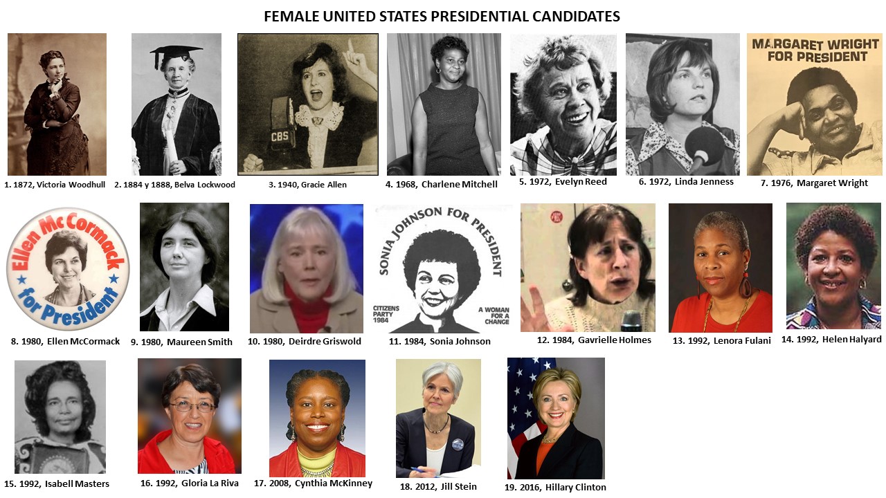 ELECTION. Victoria Woodhull, Belva Lockwood, Gracie Allen, Charlene Mitchell, Sonia Johnson, Gavrielle Holmes, Lenora Fulani, Helen Halyard, Isabell Masters, Gloria La Riva, Cynthia McKinney, Jill Stein, Hillary Clinton