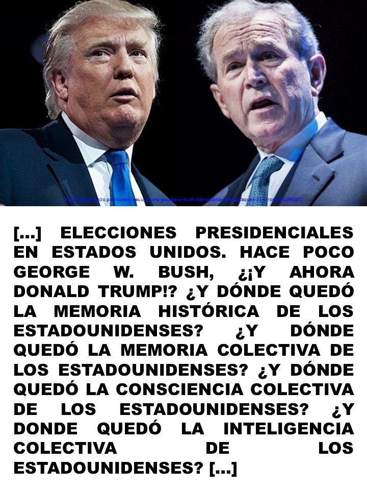 ← back to “[…] ELECCIONES PRESIDENCIALES EN ESTADOS UNIDOS. HACE POCO GEORGE W. BUSH, ¿¡Y AHORA DONALD TRUMP!? ¿Y DÓNDE QUEDÓ LA MEMORIA HISTÓRICA DE LOS ESTADOUNIDENSES? ¿Y DÓNDE QUEDÓ LA MEMORIA COLECTIVA DE LOS ESTADOUNIDENSES? ¿Y DÓNDE QUEDÓ LA CONSCIENCIA COLECTIVA DE LOS ESTADOUNIDENSES? ¿Y DONDE QUEDÓ LA INTELIGENCIA COLECTIVA DE LOS ESTADOUNIDENSES? […] ¿Recuerdan ustedes lo que dijo el escritor y guionista estadounidense Howard Fast, que fue el que escribió la novela Spartacus (Espartaco), en la que se fundamentó la película Spartacus (Espartaco), de Stanley Kubrick, protagonizada por Kirk Douglas?: “Americans have no sense of history. And not much memory. They don’t remember what happened yesterday.” “Los estadounidenses no tienen sentido de la historia. Y no tienen mucha memoria. No recuerdan lo que pasó ayer.” […] Ésta sigue siendo, y será, “la pregunta de los 64 mil…” […] ¿Cómo es posible que hoy, habiendo Internet hasta en las selvas y en el medio de los océanos, que todo el mundo puede enterarse de todo, en todos los idiomas de este mundo, en los 5 continentes, un individuo como Donald Trump pueda llegar a ser un candidato a la presidencia en uno de los dos países más poderosos del planeta: Estados Unidos de América (el otro país más poderoso del mundo, como todos sabemos, es Rusia) […] Entiendo que estas “cosas raras” pasen en nuestros países latinoamericanos atrasados, tercermundistas, en donde hasta el aire que se respira está intoxicado de corrupción, en donde un voto vale 8 dólares o menos, en donde se le da una bolsita con arroz, frijoles y aceite a cualquiera en la calle, o se le da una tortica con huevo y frijol y un refresco de Coca-Cola, y ya, eso es lo que vale un voto, entiendo que estas “cosas raras” pasen en nuestros países iberoamericanos, con un historial avergonzante de dictaduras partidistas, dictaduras militares y golpes de estado, ¿¡pero que la corrupción electoral, que el fraude electoral, esté a la orden del día en la potencia más grande del mundo, que decide en parte, junto a Rusia, la suerte de este planeta!? Como se dice por allá: “¡Ay, güey…!” […] Hace rato ya que el Partido Republicano de Estados Unidos, GOP, viene en una decadencia imparable. Y ahora, por lo visto, ya llegó al límite. ¿O es que todavía veremos mucho más? Lo de la llegada de George W. Bush a la presidencia, el hombre que casi destruye a Estados Unidos y que abrió la Caja de Pandora del terrorismo debido a su ataque o invasión a Irak (o Iraq), en busca de unas armas de destrucción masiva que, en realidad, nunca existieron, lo entendemos: en aquellos tiempos en que George W. Bush fue electo presidente no había Internet masificada, muchas cosas no se sabían, y si se sabían no tenían difusión masificada, aparte de las más que conocidas “controversias electorales” en su contra (en contra de Bush) en las elecciones relacionadas con su primer mandato, 2001-2005, cuando su contrincante demócrata fue Al Gore, y aquí el escándalo más grande que afecta a George W. Bush en ese momento, que se ha llamado incluso claramente y sin duda alguna FRAUDE ELECTORAL, fue el caso de “Florida election recount”, es decir el conteo de los votos, escándalo en el que está involucrado su hermano Jeb Bush, que en ese momento era gobernador del estado de Florida […] y luego con el segundo mandato, 2005-2009, cuando su contrincante demócrata fue John Kerry, y aquí destacan, como principales problemas que afectan a la elección de Bush como presidente, el caso Ohio y las máquinas empleadas para la votación, vinculadas con Diebold Election Systems […] Lo de los “pucherazos” (fraudes electorales) de la familia Bush, concretamente de los hermanos George W. Bush y Jeb Bush, está considerado como uno de los momentos más vergonzosos en la historia política de Estados Unidos y los estadounidenses y un fuerte golpe para la democracia de este país […] De George W. Bush se ha dicho “de todo”, tanto en el extranjero como en los Estados Unidos, y tanto por demócratas como por republicanos. Y en cuanto a Jeb Bush, si es que algo estuvo oculto alguna vez, ahora Donald Trump se ha encargado de gritarlo a los cuatro vientos, y ahora la imagen de Jeb Bush en Estados Unidos y en el mundo entero es, gracias a Trump, la de un bobo, un idiota, un mediocre, un político insignificante, “un bueno para nada”. Y Trump no solamente ha puesto en ridículo siempre a Jeb Bush, sino que ha ido mucho allá, lo ha hecho con la familia de Jeb, en especial con su esposa, la mexicana, nacida en el estado de Guanajuato, Columba Bush (Columba Garnica Gallo) […] ¿Qué pasa con esa memoria histórica de los estadounidenses? ¿Qué pasa con esa memoria colectiva de los estadounidenses? Hace poco George W. Bush, ¿y ahora Donald Trump? Creo que ya “se pasaron” […] ¿CÓMO INTERPRETAR EL DISCURSO VERBO-CORPORAL DE DONALD TRUMP? […] COMUNICACIÓN VERBAL, COMUNICACIÓN NO VERBAL, LENGUAJE CORPORAL. PARÁMETROS A ANALIZAR: ALGARABIA, AMBIGÜEDAD, ANALFABETISMO FUNCIONAL, ANFIBOLOGÍA, ARROGANCIA, CANTINFLEAR, CIRCUNLOQUIO, COMPLEJO DE SUPERIORIDAD, COPROLALIA, DARWINISMO SOCIAL, DISFUNCION DISCURSIVA EN CONTEXTO SITUACIONAL DE ALTA CULTURA, ALTA GOBERNACIÓN Y ALTA POLÍTICA, EN ESPECIAL EN EL ÁMBITO INTERNACIONAL, DIVAGACIÓN, ECOLALIA, ECOPRAXIA, EGOCENTRISMO, EGOMANÍA, EUGENESIA, FALACIA, FLOREAR, FLOREO LEXICOGENÉSICO, FLOREO VERBAL, GLOSOLALIA, HIPÉRBOLE, JITANJÁFORA, LOGORREA, MARGINACIÓN, MEGALOMANÍA, MENTIRA, MENTIROSO EMPEDERNIDO, MENTIROSO EN SERIE, MENTIROSO PATOLÓGICO, MENTIROSO PROFESIONAL, MITOMANIA, MITÓMANO, MITOTE, MITOTERO, NARCISISMO, PALILALIA, PENDIENTE RESBALADIZA, PERÍFRASIS, RACISMO, RACISMO CASUAL, RACISMO ENCUBIERTO, RACISMO NO EXPLÍCITO, RACISMO OCULTO, RODEO, SEGREGACIÓN, SESGO COGNITIVO, VAGUEDAD, VANIDAD, VERBORRAGIA, VERBORREA, VERBOSIDAD […]”