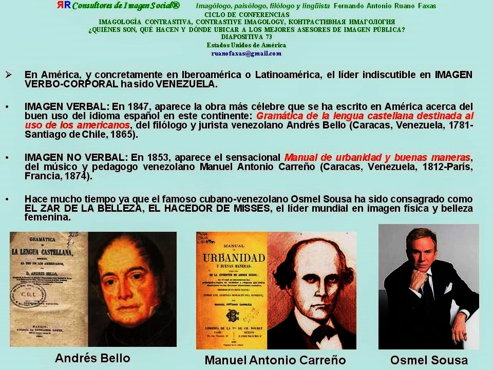 FERNANDO ANTONIO RUANO FAXAS. IMAGOLOGÍA CONTRASTIVA, CONTRASTIVE IMAGOLOGY, КОНТРАСТИВНАЯ ИМАГОЛОГИЯ . VENEZUELA LÍDER DE LA IMAGEN VERBAL Y NO VERBAL, BELLO, CARREÑO, SOUSA