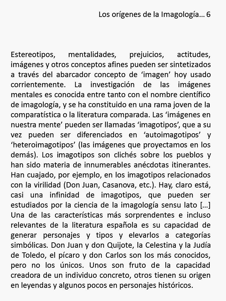 ← back to “#Imagología #Imagology #Имагология #Imagologie […] Tal y como se ha planteado ya, los orígenes de la Imagología hay que buscarlos en Jean-Marie Carré (Жан-Мари Карре) y su obra Les Écrivains français et le mirage allemand (Los escritores franceses y el espejismo alemán, French Writers and the German Mirage, Французские писатели и немецкий мираж), de 1947, y en Marius-François Guyard (Мариус-Франсуа Гийяр), en su obra La Littérature comparée (La literatura comparada, The Comparative Literature, Сравнительное литературоведение), de 1951 […] Imagología, Imagology, Имагология, Imagologie […] es un término habitualmente usado en Filología, Philology, Филология, Philologie, en Literatura, Literature, Литература, Littérature, Literatur […] Comparatística, Hermenéutica Intercultural, Textología y Estudios Literarios en general (Ruano Faxas, 1987; Ruano Faxas, 1989; Kundera, 2003; Colectivo de autores, 1988; Moll, 1999; Moura, 1999; Sánchez, 2004; Colectivo de autores, 2004; López de Abiada, 2004; Ribeiro de Sousa, 2004), es un término conocido y reconocido en Europa por lo menos a partir de 1940. Casi en general, Imagología y Hermenéutica Intercultural son la misma cosa. “El poder de las imágenes –no importa si están en sintonía con la ‘realidad’– es indiscutible y de fácil percepción, como podemos constatar en el trato mutuo entre pueblos. Estereotipos, mentalidades, prejuicios, actitudes, imágenes y otros conceptos afines pueden ser sintetizados a través del abarcador concepto de ‘imagen’ hoy usado corrientemente. La investigación de las imágenes mentales es conocida entre tanto con el nombre científico de imagología, y se ha constituido en una rama joven de la comparatística o la literatura comparada. Las ‘imágenes en nuestra mente’ pueden ser llamadas ‘imagotipos’, que a su vez pueden ser diferenciados en ‘autoimagotipos’ y ‘heteroimagotipos’ (las imágenes que proyectamos en los demás). Los imagotipos son clichés sobre los pueblos y han sido materia de innumerables anécdotas itinerantes. Han cuajado, por ejemplo, en los imagotipos relacionados con la virilidad (Don Juan, Casanova, etc.). Hay, claro está, casi una infinidad de imagotipos, que pueden ser estudiados por la ciencia de la imagología sensu lato […] Una de las características más sorprendentes e incluso relevantes de la literatura española es su capacidad de generar personajes y tipos y elevarlos a categorías simbólicas. Don Juan y don Quijote, la Celestina y la Judía de Toledo, el pícaro y don Carlos son los más conocidos, pero no los únicos. Unos son fruto de la capacidad creadora de un individuo concreto, otros tienen su origen en leyendas y algunos pocos en personajes históricos. Con el pasar del tiempo, estos personajes se han convertido en referencias culturales ineludibles, en iconos y emblemas identificatorios de la cultura española (don Quijote, don Juan, Carmen, el pícaro, el torero, el bandido, por ejemplo). Son, en suma, personajes seminales y esenciales que en cierto modo caracterizan la cultura y dan forma visible a determinados rasgos culturales que pueden plasmarse en imágenes e imagotipos.”[23] El término Imagología también se ha utilizado para tratar imágenes de la cultura iberoamericana, de la cultura latinoamericana, de la cultura hispanoamericana, como es el caso de: Juan A. Ortega y Medina (1987). Imagología del bueno y del mal salvaje. México, UNAM. Refiriéndome a esta rama de la Filología, he comentado (Ruano, 2003a): Creemos necesario recordar que, también y además, existen contextos sociales, grupos sociales, situaciones sociales, estratos sociales y hasta pueblos completos en donde las “alteraciones de la realidad” (?) son parte del modus vivendi habitual, cotidiano. Este es el caso de las culturas o sociedades utópicas y de las culturas o sociedades distópicas o cacotópicas, en las cuales, para bien o para mal –generalmente para mal–, la realidad siempre está alterada, siempre está distorsionada, y los lenguajes verbo-corporales no hacen otra cosa que expresar esa alteración, esa distorsión. Justamente por estas cuestiones anteriormente señaladas, es que tenemos que distinguir entre las imágenes sociales representadas en las culturas utópicas o “culturas con una vida tendiente al bien” y en las culturas distópicas o “culturas con una vida tendiente al mal”. Los términos utopía y distopía a veces se confunden, y ese es, justamente, un gran error imagológico. Aquí lo primero que haremos es recordar que la Imagología, a través de los años, ha sido y sigue siendo, sin duda alguna, una rama trascendental de la Filología, de la Comparatística y también de la Lingüística, que ha ayudado y sigue ayudando, y mucho, de manera multidisciplinaria, a muy variadas otras ciencias sociales y humanísticas, independientemente de que con el término “imagología” se hayan creado y recreado en la actualidad muchos nuevos conceptos y subramas científicas del tratamiento de la imagen. De tal manera, mediante los análisis imagológicos, podemos hacer distinciones muy precisas entre “lo realmente bueno” a través de una imagen social, de una conducta comunicativa verbo-corporal, y “lo realmente malo” a través de una imagen social, de una conducta comunicativa verbo-corporal. Pasemos a ver estos detalles; pero ya en el plano de la Literaturología, de la Cinematografía, de la Comunicología y de la producción televisiva en el continente americano, en donde se refleja “lo bueno” y “lo malo” de la historia y la actualidad de las tres grandes culturas en contacto en el área: mongoloides, caucasoides y negroides, además de la posible presencia australoide en nuestro continente, concretamente en la América del Sur, y 