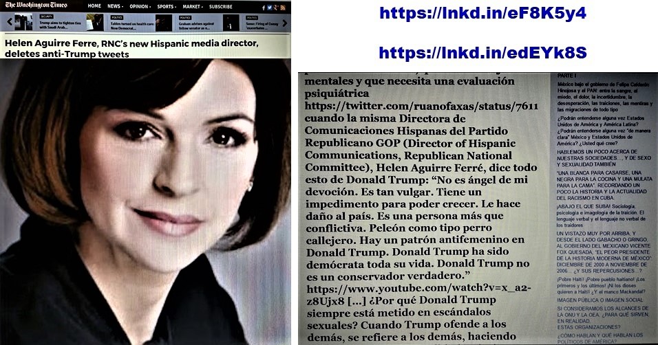 ← back to “[…] Qué trascendencia puede tener que Ruth Bader Ginsburg, jueza de la Corte Suprema de los Estados Unidos (Supreme Court of the United States), llame a Donald Trump “farsante” (“faker”) https://twitter.com/ruanofaxas/status/753926137089318912 o que el multimillonario Warren Buffett le diga a Trump “Have you no decency, sir?” “¿No tiene el menor sentido de la decencia, señor?” https://twitter.com/ruanofaxas/status/760291352949194752 o que Michelle Obama llame a Trump “matón” (“bully”) https://twitter.com/ruanofaxas/status/760145200484319233 o que Barack Obama diga “Trump no es apto para ser presidente” (“Trump is unfit to serve as president”) https://twitter.com/ruanofaxas/status/760869732065083393 , https://ruanofaxas.com/2016/07/25/elecciones-presidenciales-en-estados-unidos-hace-poco-george-w-bush-y-ahora-donald-trump-y-donde-quedo-la-memoria-historica-de-los-estadounidenses-y-donde-quedo-la-memori/ o que la congresista Karen Bass diga que Trump es un peligro para Estados Unidos, que tiene desajustes mentales y que necesita una evaluación psiquiátrica https://twitter.com/ruanofaxas/status/761182975547543556 cuando la misma Directora de Comunicaciones Hispanas del Partido Republicano GOP (Director of Hispanic Communications, Republican National Committee), Helen Aguirre Ferré, dice todo esto de Donald Trump: “No es ángel de mi devoción. Es tan vulgar. Tiene un impedimento para poder crecer. Le hace daño al país. Es una persona más que conflictiva. Peleón como tipo perro callejero. Hay un patrón antifemenino en Donald Trump. Donald Trump ha sido demócrata toda su vida. Donald Trump no es un conservador verdadero.” https://www.youtube.com/watch?v=x_a2-z8Ujx8 […] ¿Por qué Donald Trump siempre está metido en escándalos sexuales? Cuando Trump ofende a los demás, se refiere a los demás, haciendo referencia a sexo, sexualidad, relaciones sexuales, ¿no es eso “escupir para arriba”? “Quien tiene tejado de vidrio que no tire piedras al de su vecino”, “No tires piedras a tu vecino si tienes una casa de cristal”, “No tires piedras a los techos ajenos si tu techo es de cristal” […]”
