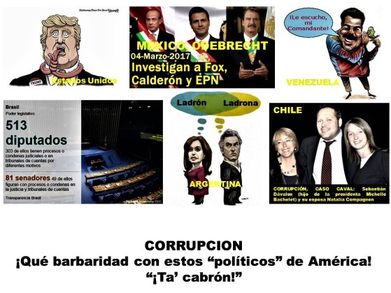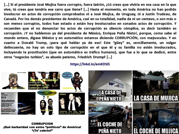 […] Si el presidente José Mujica fuera corrupto, fuera ladrón, ¿tú crees que viviría en esa casa en la que vive, tú crees que tendría ese carro que tiene? […] Hasta el momento, en toda América no han podido involucrar en actos de corrupción comprobados ni a José Mujica, de Uruguay, ni a Justin Trudeau, de Canadá. Por los demás presidentes de América, casi en su totalidad, nadie da ni un centavo, o son más o son menos corruptos, todos han estado o están hoy involucrados en sonados actos de corrupción. Y recuerden que el no denunciar los actos de corrupción es silencio cómplice, es decir también es corrupción. ¡Y no hablemos ya del presidente de México, Enrique Peña Nieto!, porque, como sabe el mundo entero, dígase México y en automático estamos diciendo CORRUPCIÓN, con maýusculas. Y en cuanto a Donald Trump, ¡para qué hablar ya de eso! Este “güey” es, sencillamente, un vulgar delincuente, no hay un solo tipo de corrupción en el que él y su familia no estén involucrados, incluyendo la prostitución (que en automático es tráfico humano), que fue a lo que se dedicó, entre otros “negocios turbios”, su abuelo paterno, Friedrich Drumpf […]