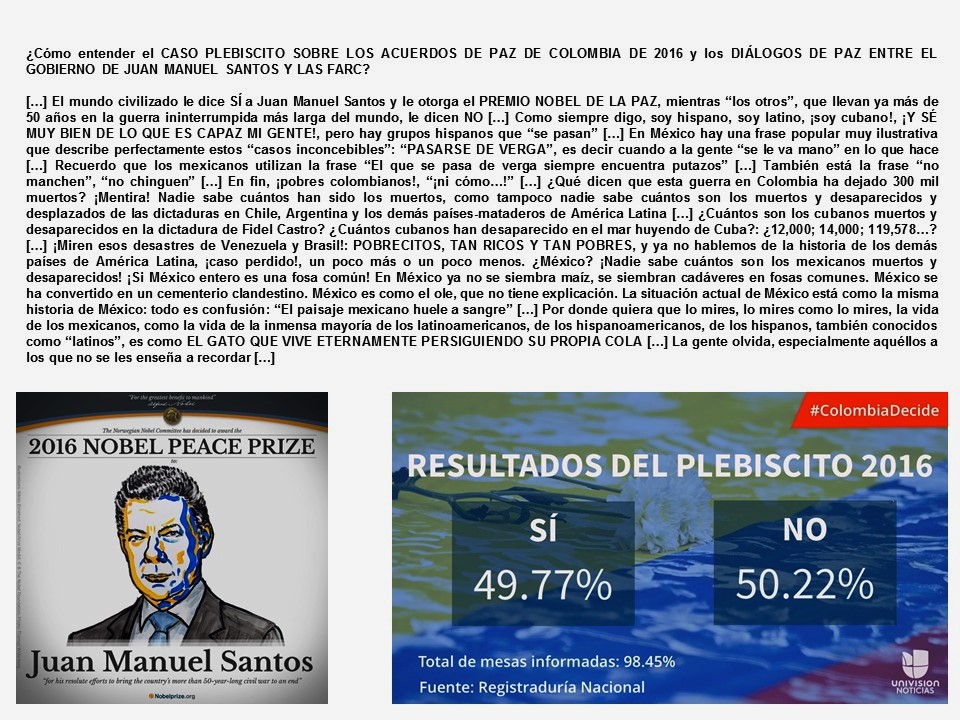 ← back to “[…] ¿Cómo entender el CASO PLEBISCITO SOBRE LOS ACUERDOS DE PAZ DE COLOMBIA DE 2016 y los DIÁLOGOS DE PAZ ENTRE EL GOBIERNO DE JUAN MANUEL SANTOS Y LAS FARC? […] El mundo civilizado le dice SÍ a Juan Manuel Santos y le otorga el PREMIO NOBEL DE LA PAZ, mientras “los otros”, que llevan ya más de 50 años en la guerra ininterrumpida más larga del mundo, le dicen NO […] Como siempre digo, soy hispano, soy latino, ¡soy cubano!, ¡Y SÉ MUY BIEN DE LO QUE ES CAPAZ MI GENTE!, pero hay grupos hispanos que “se pasan” […] En México hay una frase popular muy ilustrativa que describe perfectamente estos “casos inconcebibles”: “PASARSE DE VERGA”, es decir cuando a la gente “se le va mano” en lo que hace […] Recuerdo que los mexicanos utilizan la frase “El que se pasa de verga siempre encuentra putazos” […] También está la frase “no manchen”, “no chinguen” […] En fin, ¡pobres colombianos!, “¡ni cómo…!” […] ¿Qué dicen que esta guerra en Colombia ha dejado 300 mil muertos? ¡Mentira! Nadie sabe cuántos han sido los muertos, como tampoco nadie sabe cuántos son los muertos y desaparecidos y desplazados de las dictaduras en Chile, Argentina y los demás países-mataderos de América Latina […] ¿Cuántos son los cubanos muertos y desaparecidos en la dictadura de Fidel Castro? ¿Cuántos cubanos han desaparecido en el mar huyendo de Cuba?: ¿12,000; 14,000; 119,578…? […] ¡Miren esos desastres de Venezuela y Brasil!: POBRECITOS, TAN RICOS Y TAN POBRES, y ya no hablemos de la historia de los demás países de América Latina, ¡caso perdido!, un poco más o un poco menos. ¿México? ¡Nadie sabe cuántos son los mexicanos muertos y desaparecidos! ¡Si México entero es una fosa común! En México ya no se siembra maíz, se siembran cadáveres en fosas comunes. México se ha convertido en un cementerio clandestino. México es como el ole, que no tiene explicación. La situación actual de México está como la misma historia de México: todo es confusión: “El paisaje mexicano huele a sangre” […] Por donde quiera que lo mires, lo mires como lo mires, la vida de los mexicanos, como la vida de la inmensa mayoría de los latinoamericanos, de los hispanoamericanos, de los hispanos, también conocidos como “latinos”, es como EL GATO QUE VIVE ETERNAMENTE PERSIGUIENDO SU PROPIA COLA […] La gente olvida, especialmente aquéllos a los que no se les enseña a recordar […]”